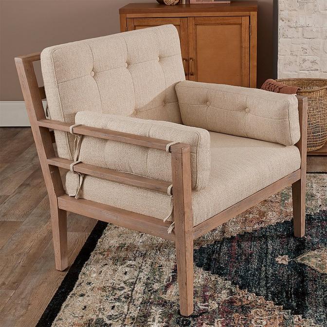 This modern lounge chair is the perfect spot to rest your bones after a day on the water. Tie-on back and arm cushions feature button tufting and add to the comfort of the upholstered seat. Because this product features a variety of distressing techniques like sandblasting, bleaching, drawknife, and wormholes, no two will be exactly alike.