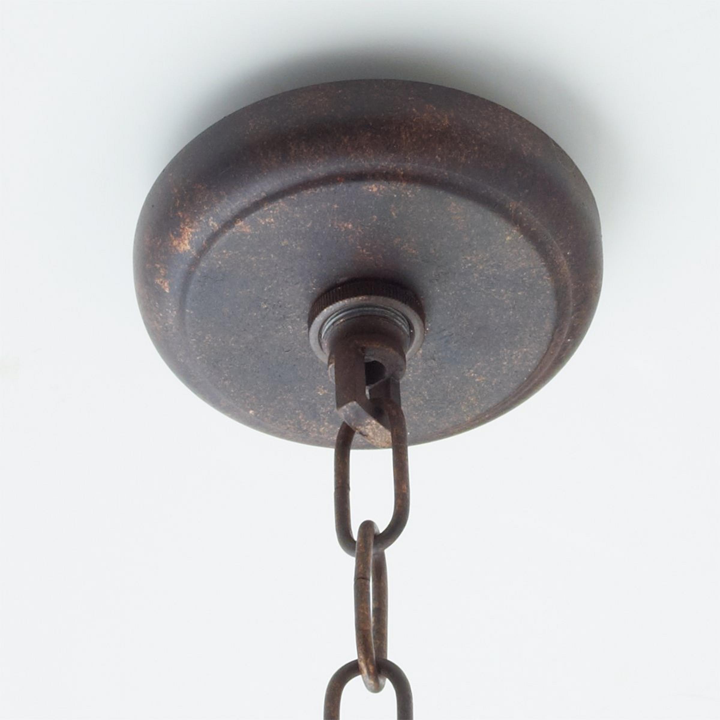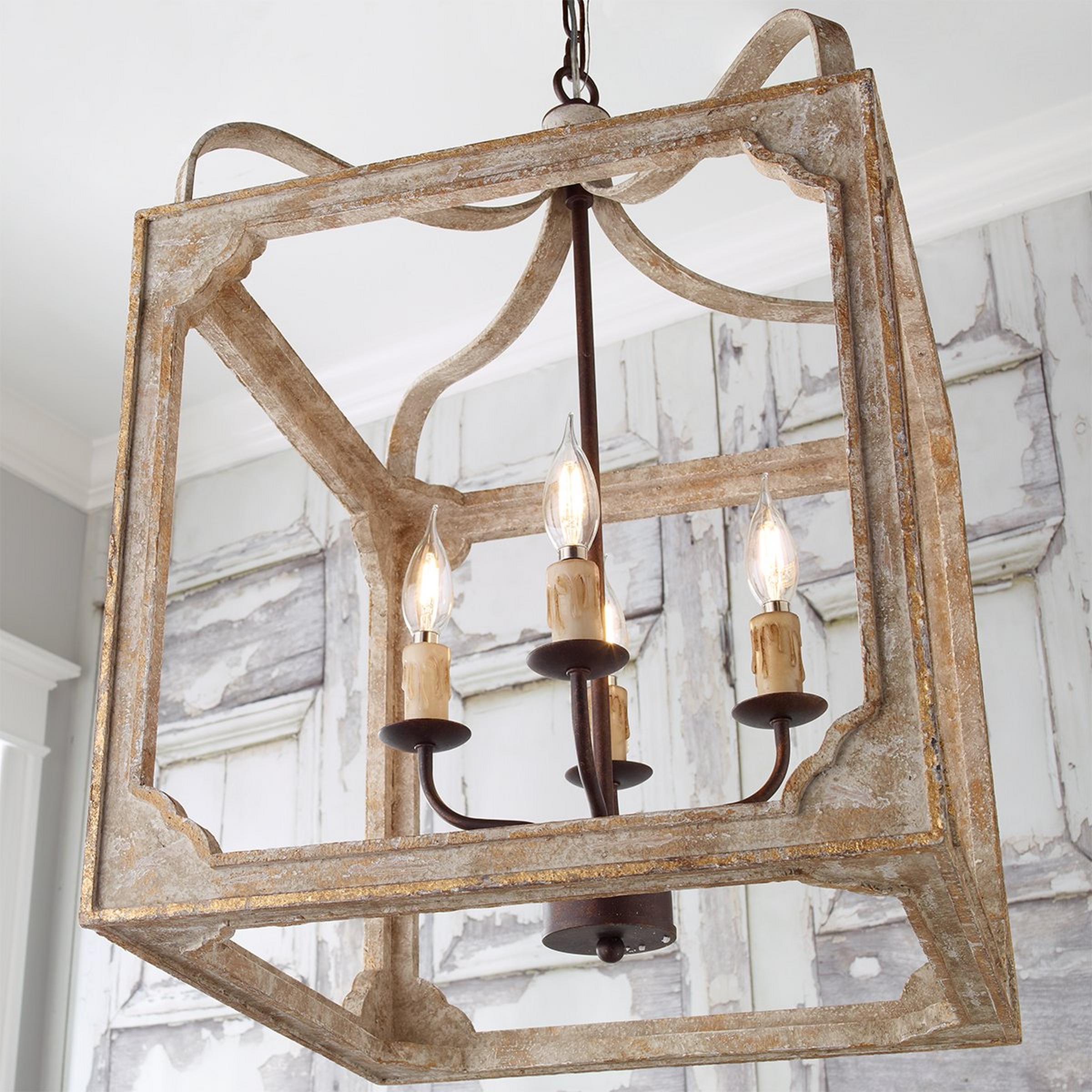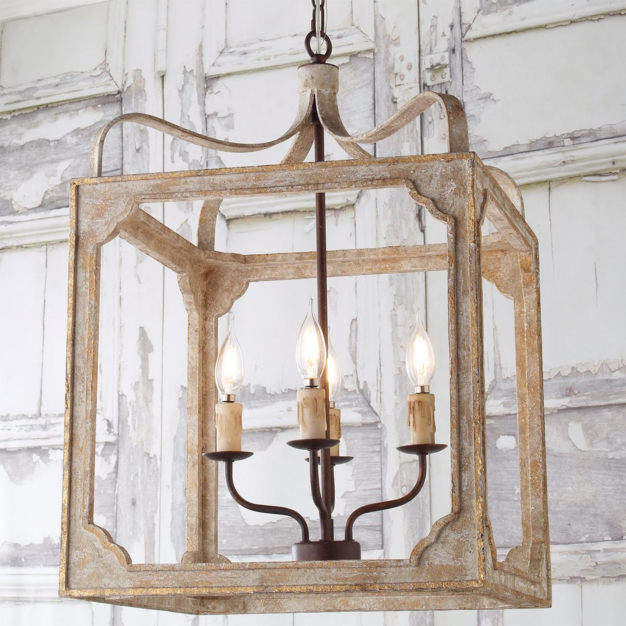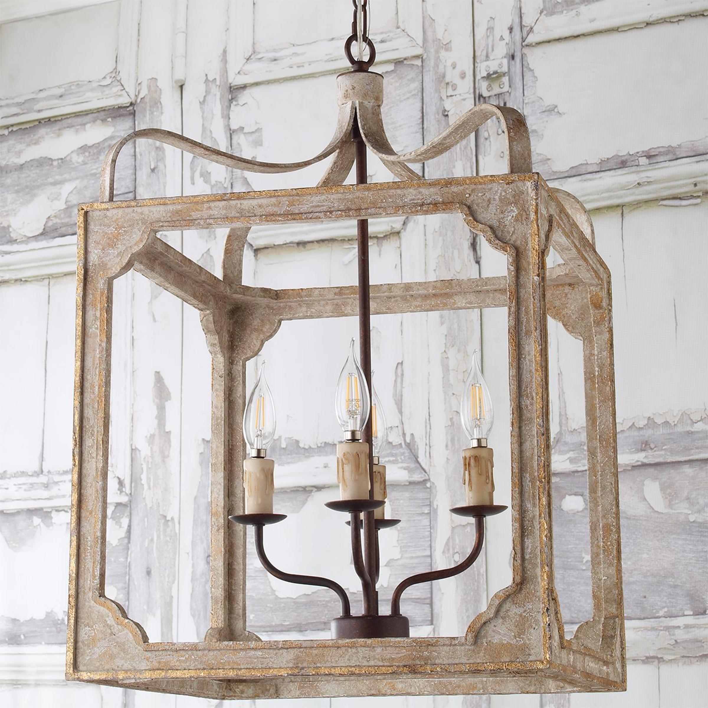 A distressed wood frame in washed gray with golden trim is held aloft by four scrolled iron arms, giving this fixture a romantic, weathered cottage-style look and feel. Place this boxy lantern-style chandelier in a foyer or group several above a large island or dining table.