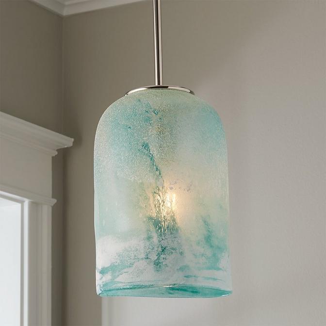 Sink into the serene simplicity of sandy shores with the soft and subtle Breezy Bay Pendant. This charming fixture adds splashes of color to beachy decor themes with a cheerful blend of lightly textured white and turquoise glass. Because of the nature of art glass, variations in color, pattern, and texture should be expected and celebrated; no two art glass pieces are exactly alike, making each of these lovely fixtures truly one-of-a-kind! Please note certain colors and patterns may be more or less prominent when the pendant is lit or unlit. This fixture is assembled by hand in our Richmond, Virginia production facility.