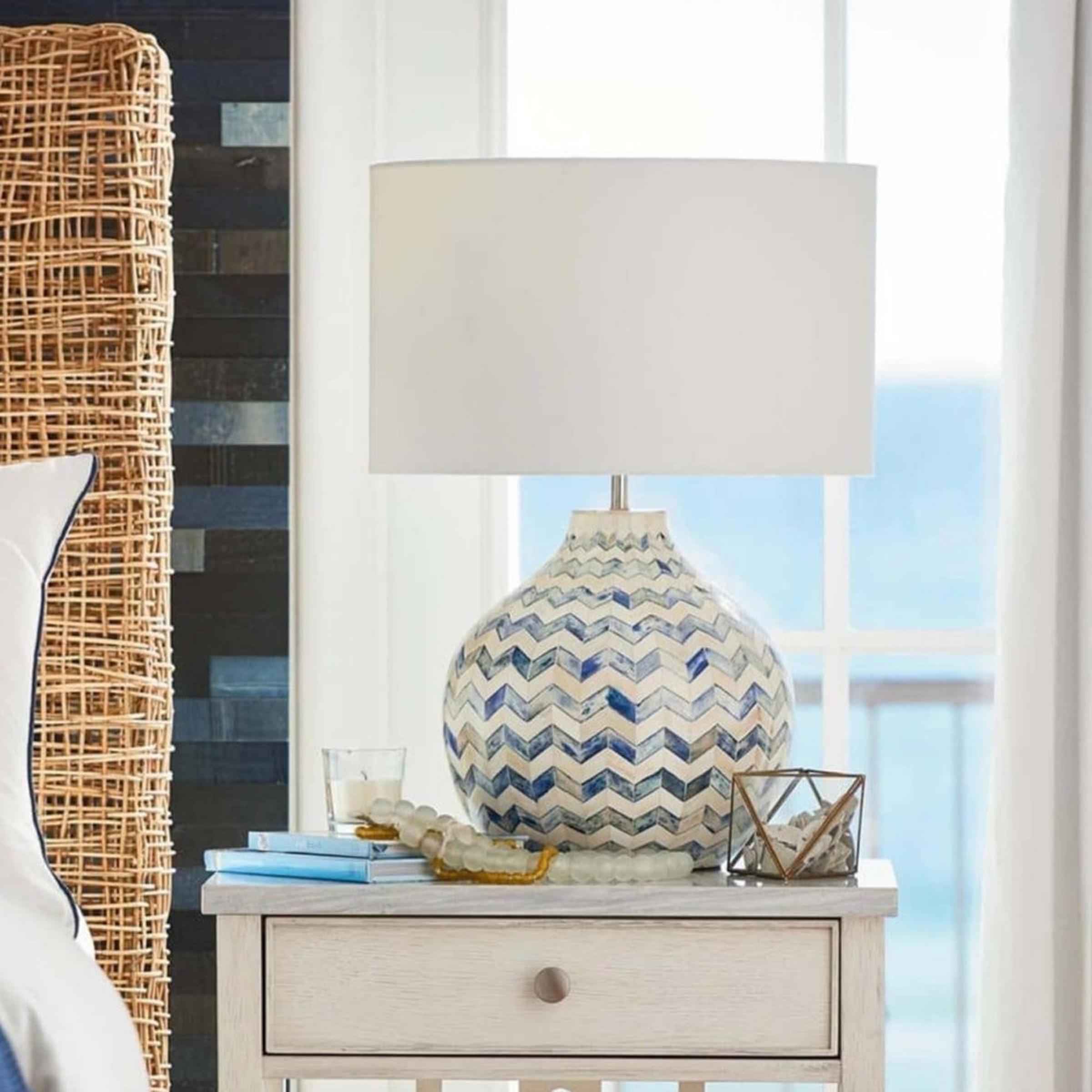 This table lamp, sharing a classic silhouette with ceramic vases, is made of bone inset in a dazzling mosaic pattern. The delicate curves of the base make it a stylish addition to a tidy bedside table or living room sideboard.