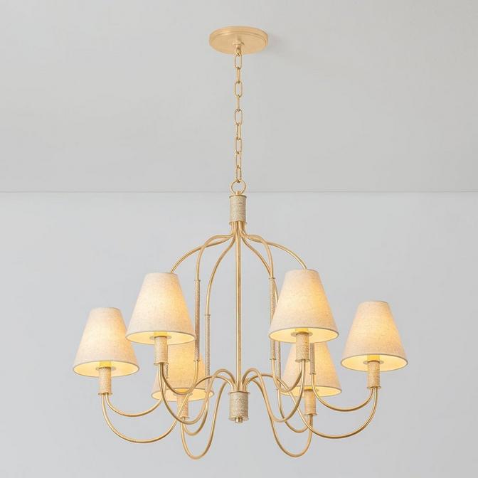 Crafted with support rods that swing in sweeping gestures, this grand chandelier is inspired by Rococo brilliance. Modern twists update the style through contrasting materials such as the natural abaca rope that winds itself around the stems of the fixture and tempers the look to create a more casual, inviting atmosphere.