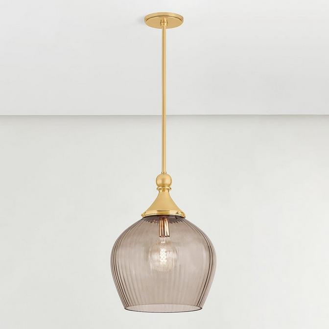 This pendant serves as a stylish accent piece with classic features. The tinted scalloped shade adds a decorative flair alongside the metalwork that clutches it, and it is well suited for any kitchen or dining room.