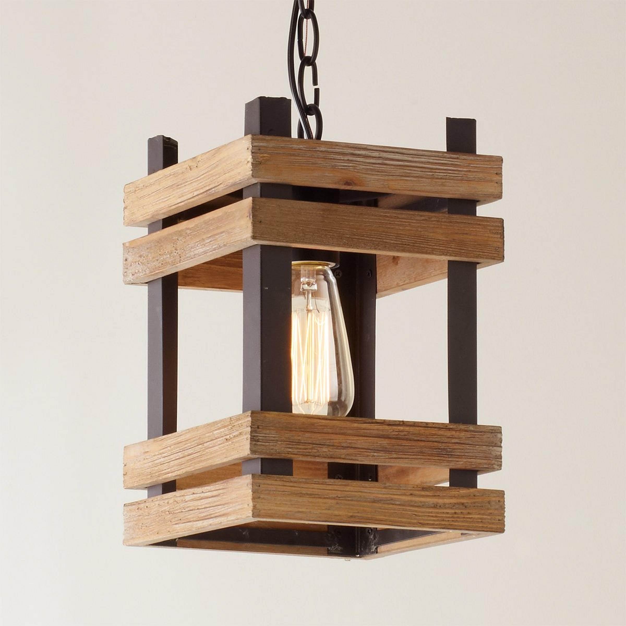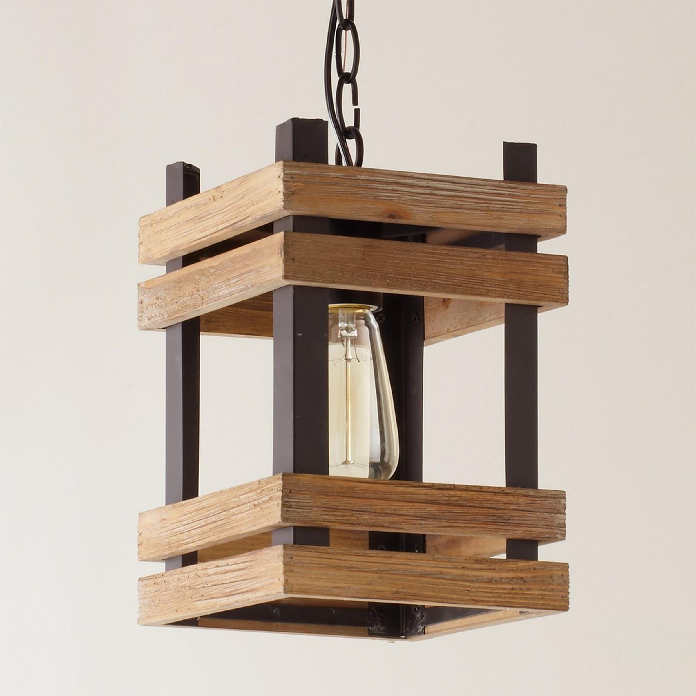 Inspired by Craftsman style architecture this wood and metal pendant in a distressed finish will add rustic style to your home. 5" black canopy, 6' of cord and 3' of chain included. (12"H x 7.5"W). 60 watt max medium base socket.