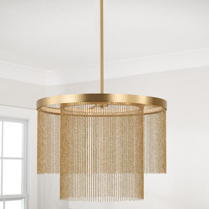 When light cascades down the gilded chains of this stunning chandelier, the reflected sparkle creates a mesmerizing effect. Nestled into the fixture's frame, the integrated LED circles illuminate the tiers of chain for a waterfall of metallic light. The delicate feel of the thin chains, layered into two tiers, gives this piece an opulent look. Its distinct gradient effect creates a glimmering effect reminiscent of crystal chandeliers, but reimagined with innovation. Its monochrome color enhances your space, providing a soft, moody glow.