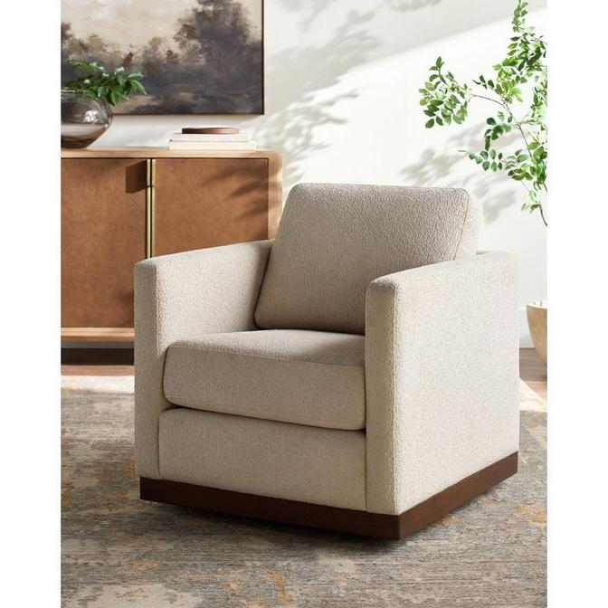 The Caiden Accent Chair's traditional shape and fully upholstered frame effortlessly completes your space. The fabric's plush cushioning adds a soft texture, creating a cozy feel in your home. Enjoy seamless movement with its swivel base, complemented by a stained wooden foundation for a polished appearance. Its warm neutral tones elevate your home with a calming feel, complementing a myriad of design styles and rooms. Pair alongside your favorite couch or add comfort to a parlor with this charming accent piece!