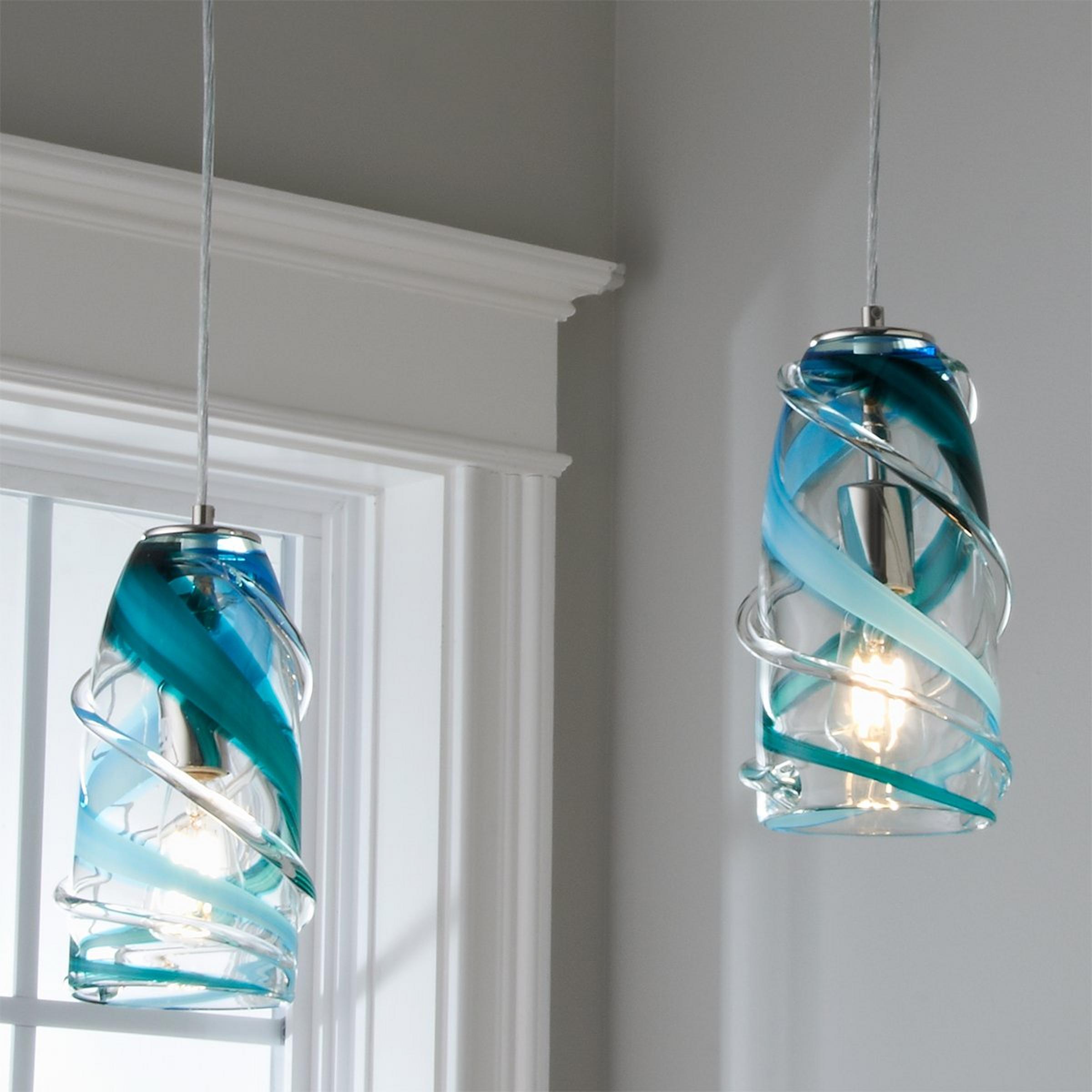 This beautiful swirling glass pendant with the added sculptural glass accentuating the swirl pattern on the outside is a unique, exciting take on a classic art glass pendant. The gentle aqua color palette blends beautifully into a beach house or coastal style space. This fixture also works as an unexpected pop of color in a more traditional room design. Try this unique pendant over a kitchen island, breakfast bar, or any other area where task lighting is needed. Due to the nature of this handblown art glass no two will be exactly alike in pattern or color.