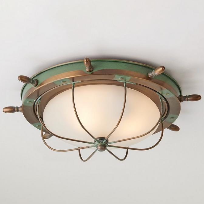 Add a fresh spin to your scenery and steer your nautical decor in the right direction with this steel ship's wheel ceiling light. The frosted glass and metal cage are perfect for nautical- and coastal-themed homes.