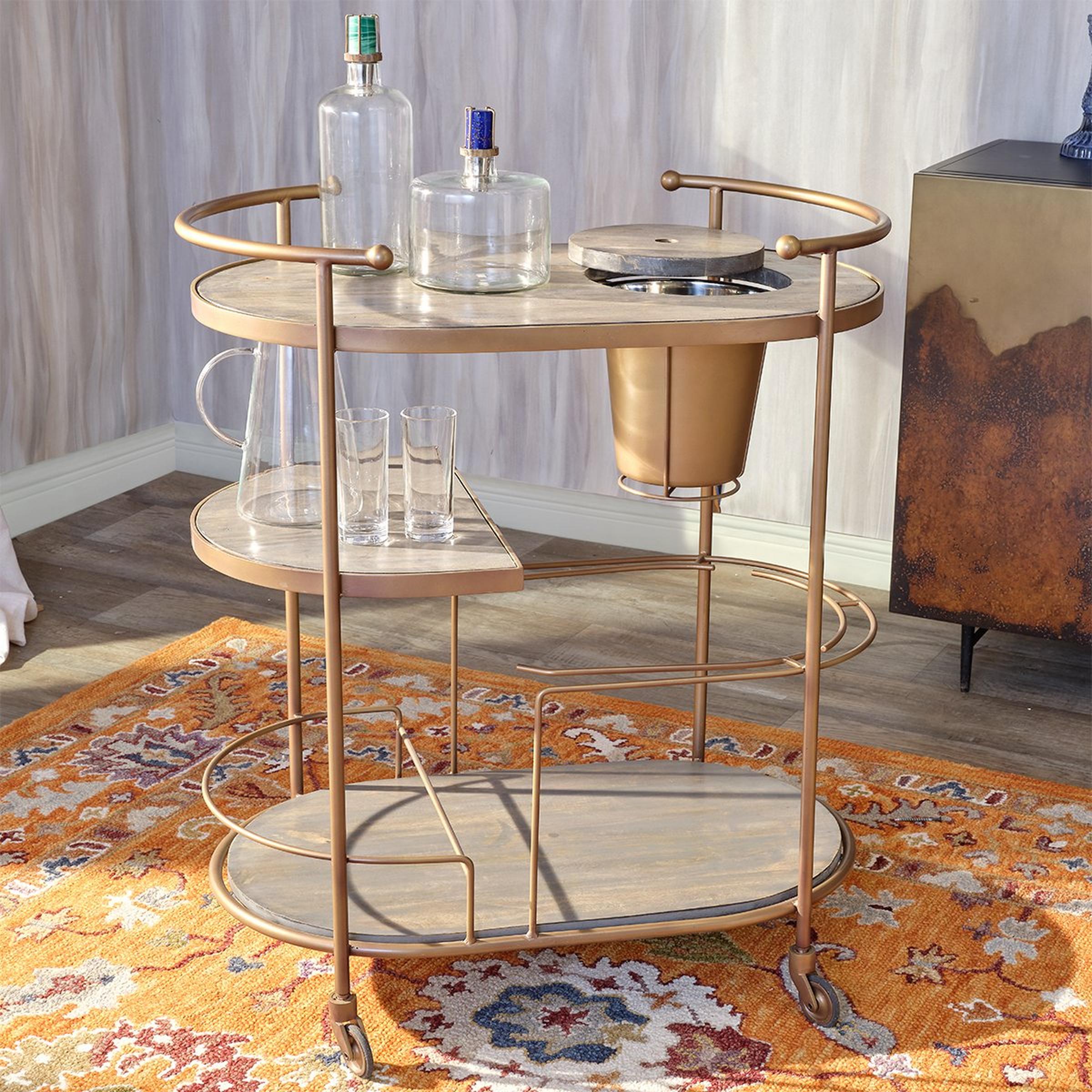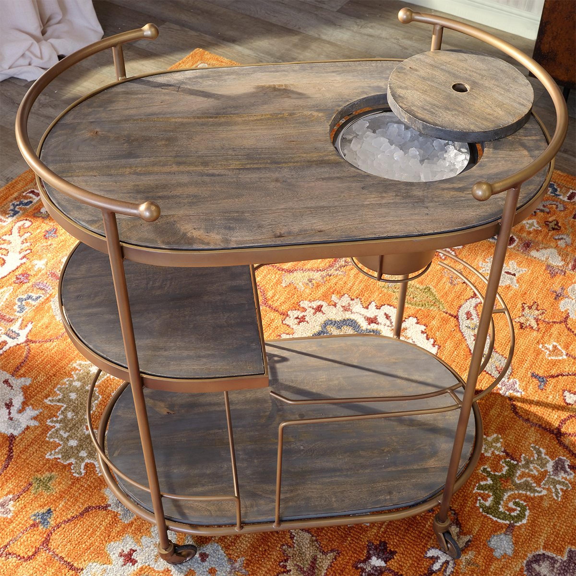 The Carrito Bar Cart blends elegant Art Deco design with practicality, making it a versatile addition to any bar or dining room. Its sturdy construction ensures durability, and the Antique Brass finish adds warmth. Designed for functionality, it provides space for all your barware and accessories. Enhance your entertaining experience and create stylish, memorable moments with family and friends.