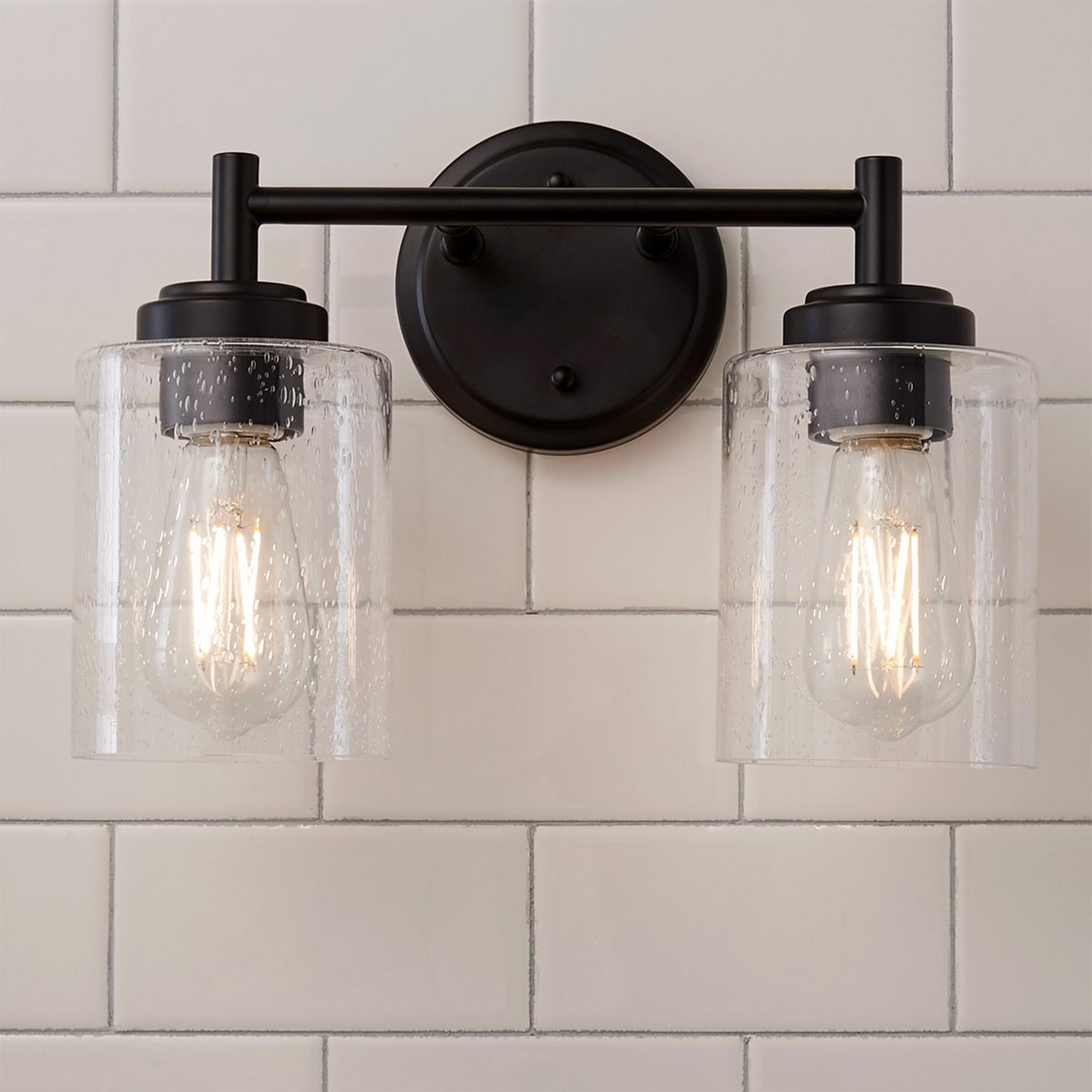 The round backplate and simple body of our Cassandra Vanity Light create a modern classic look that matches with a range of fashionable decor. The seeded glass shades add texture and interest, breaking up the sleek aesthetic with quaint charm.