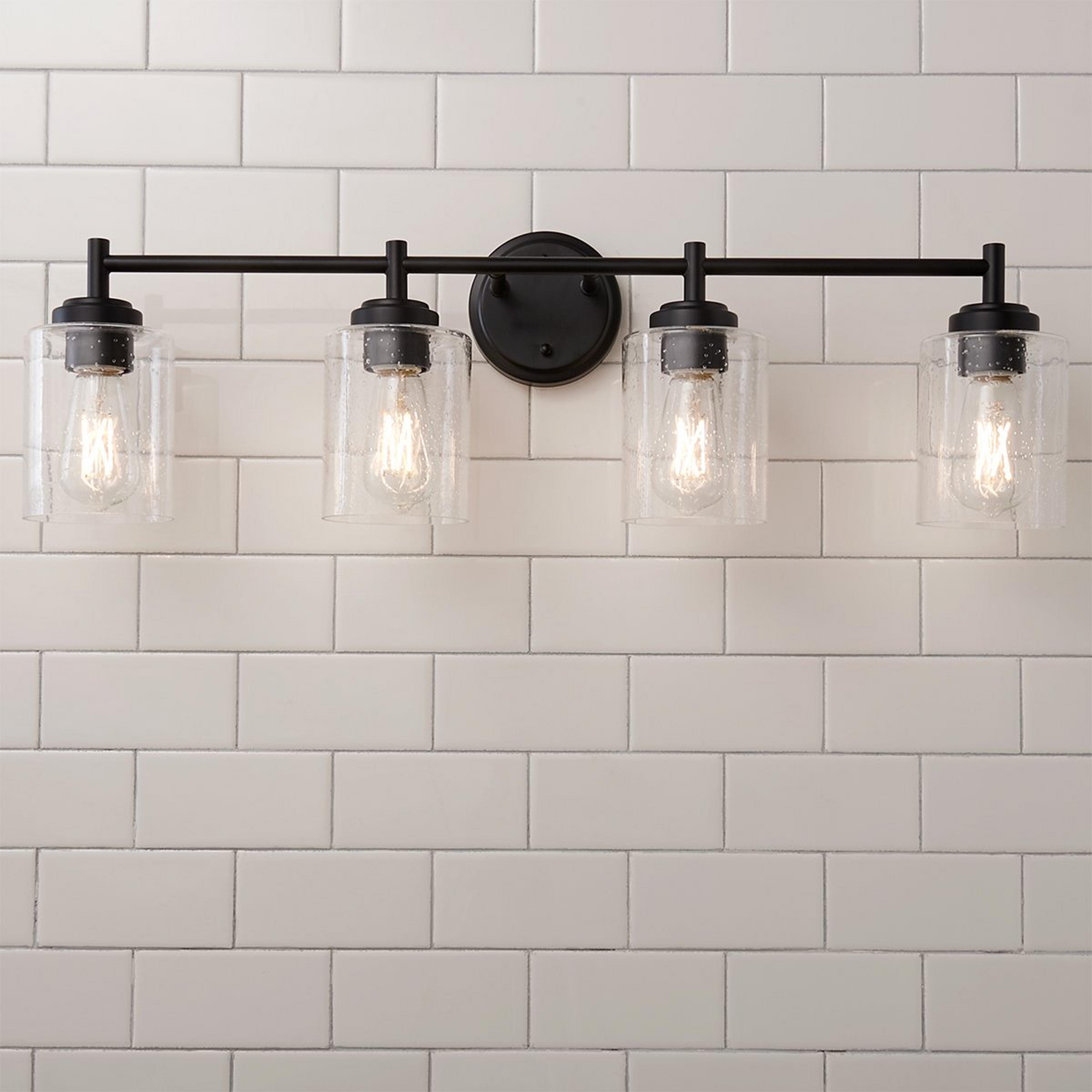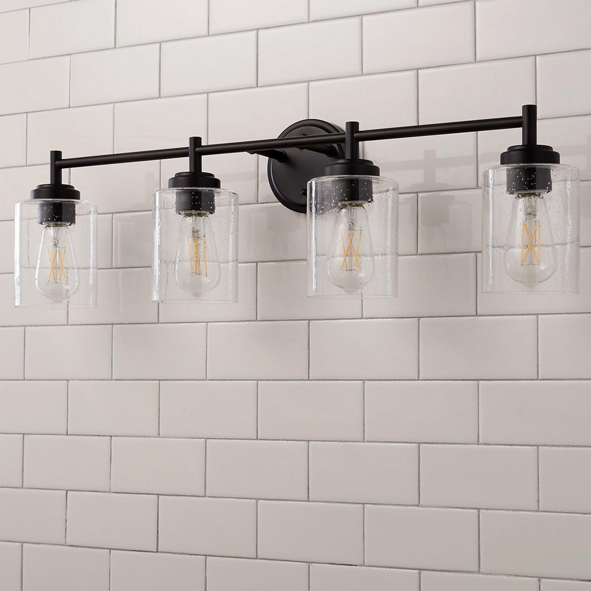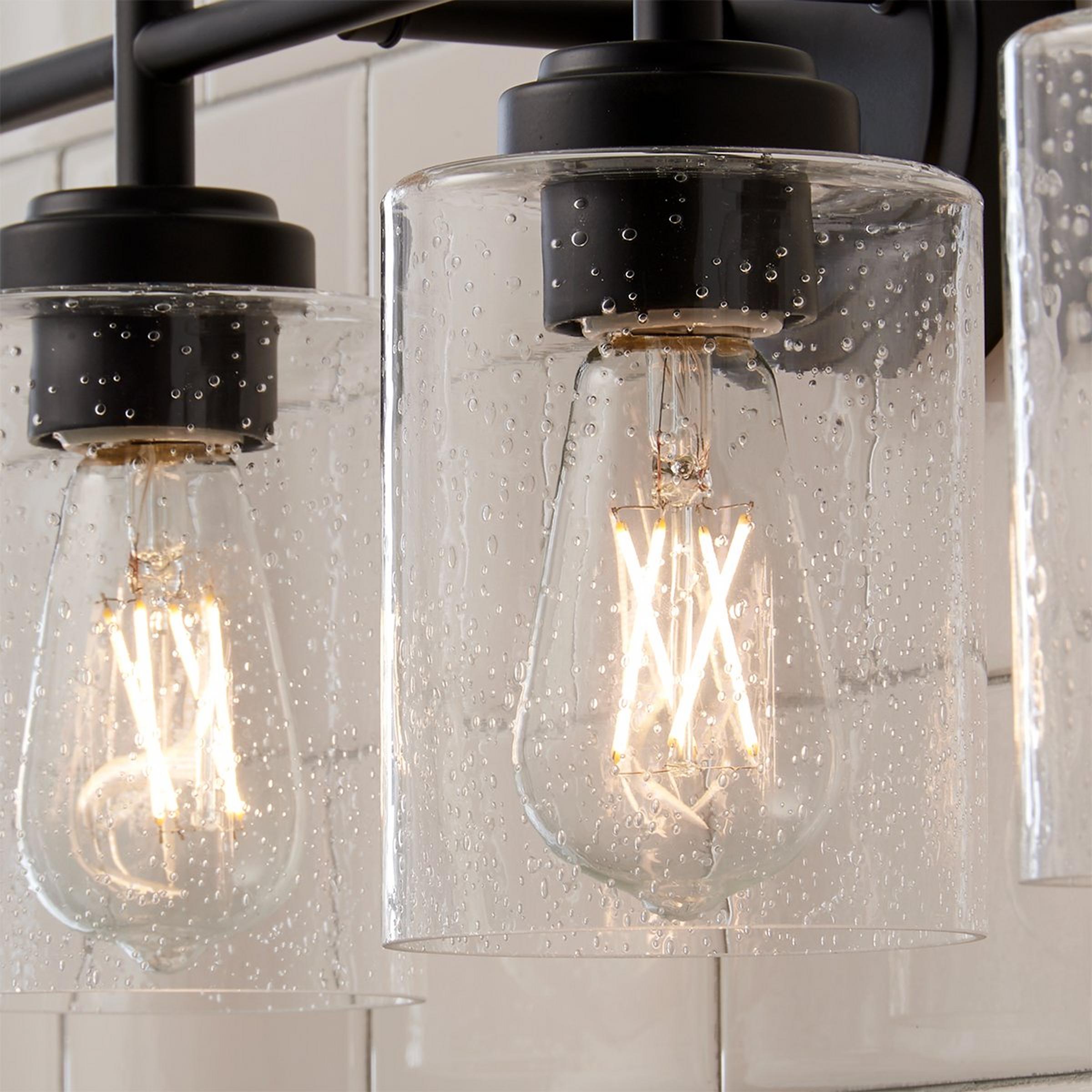 The round backplate and simple body of our Cassandra Vanity Light create a modern classic look that matches with a range of fashionable decor. The seeded glass shades add texture and interest, breaking up the sleek aesthetic with quaint charm.