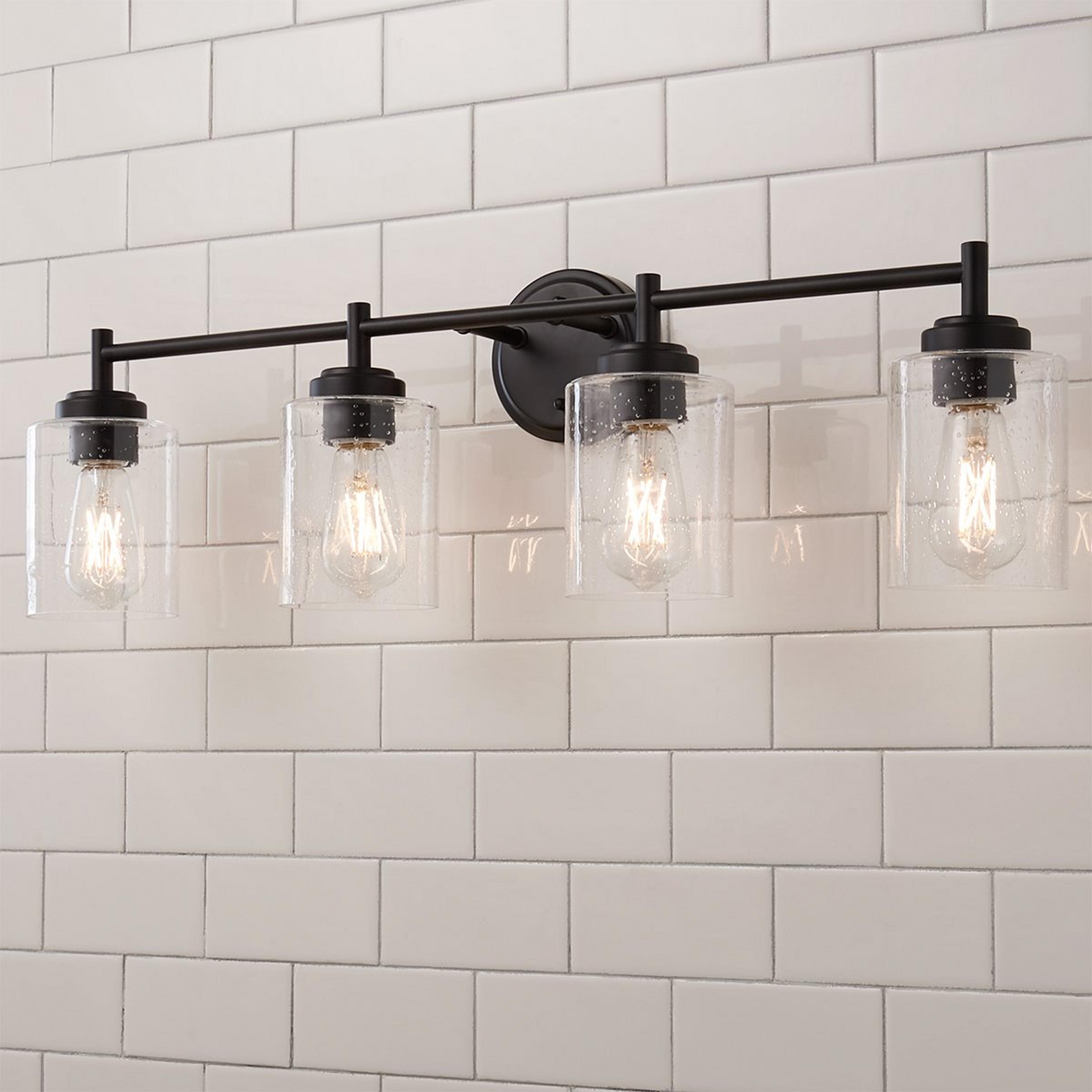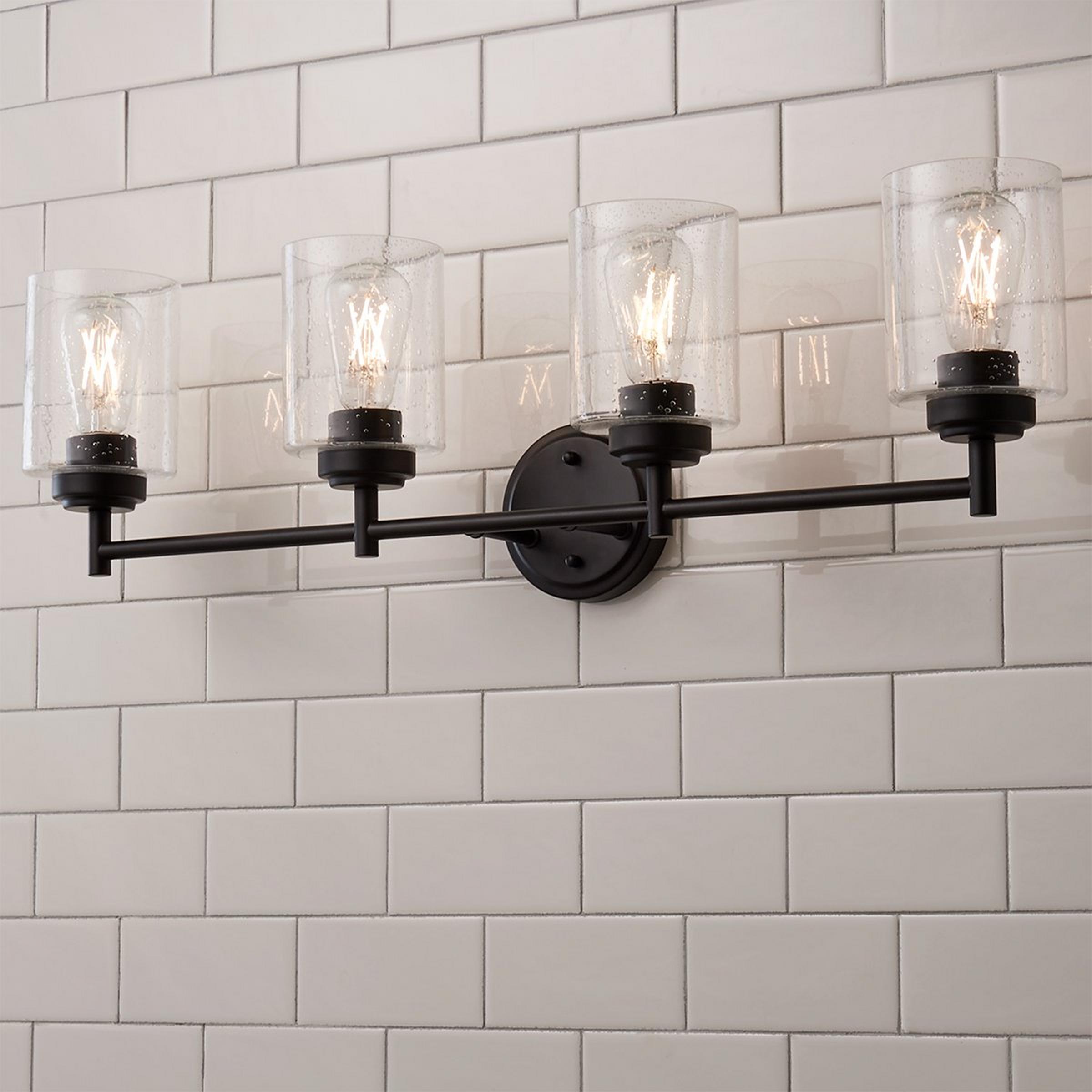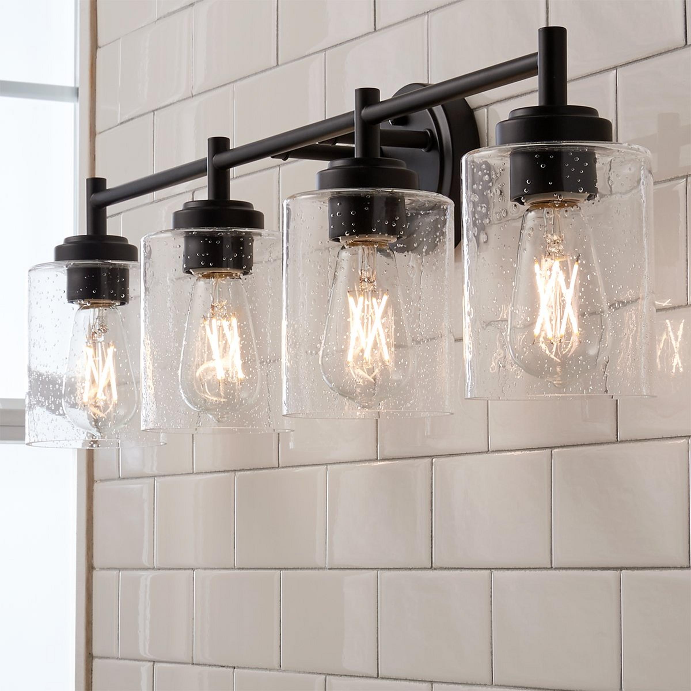 The round backplate and simple body of our Cassandra Vanity Light create a modern classic look that matches with a range of fashionable decor. The seeded glass shades add texture and interest, breaking up the sleek aesthetic with quaint charm.