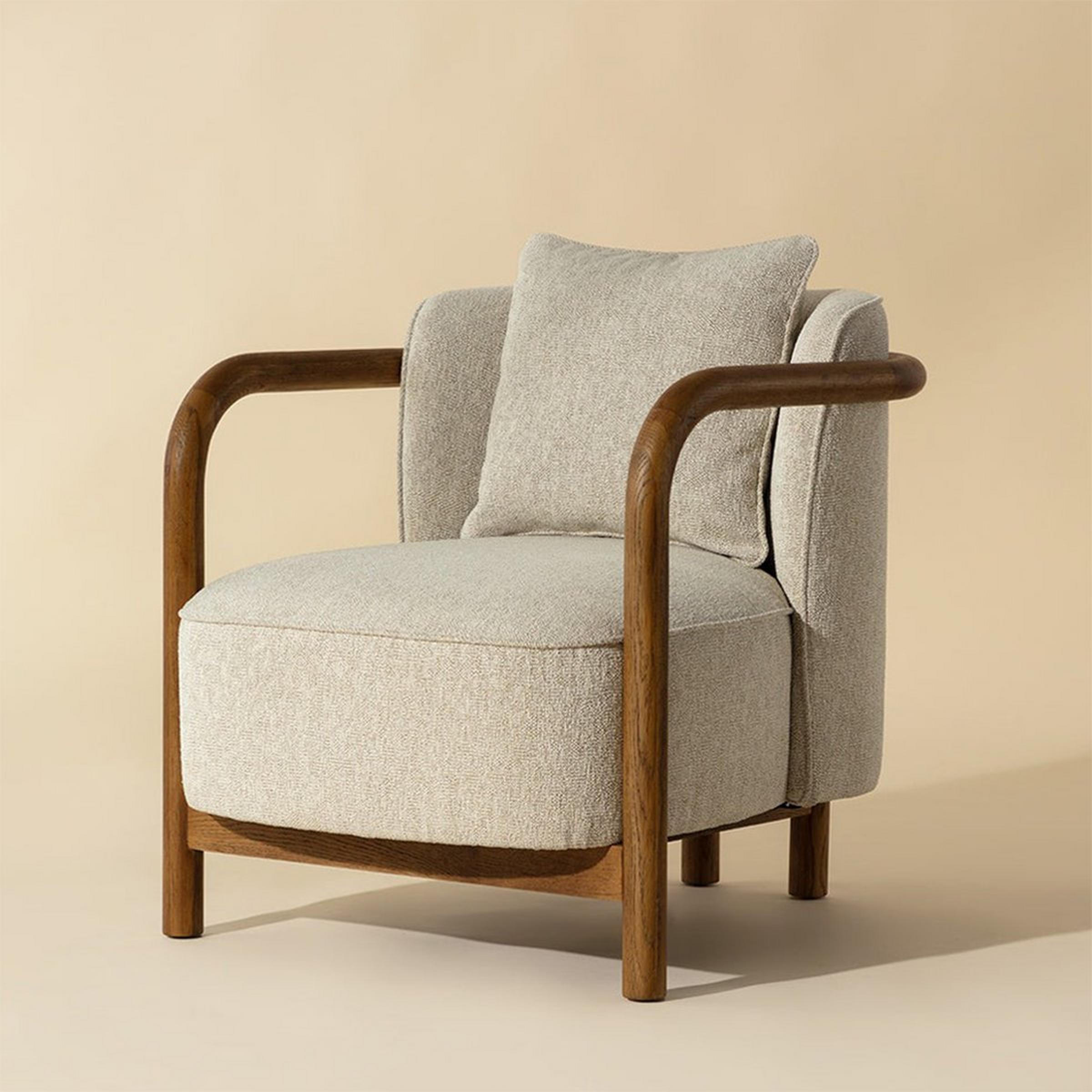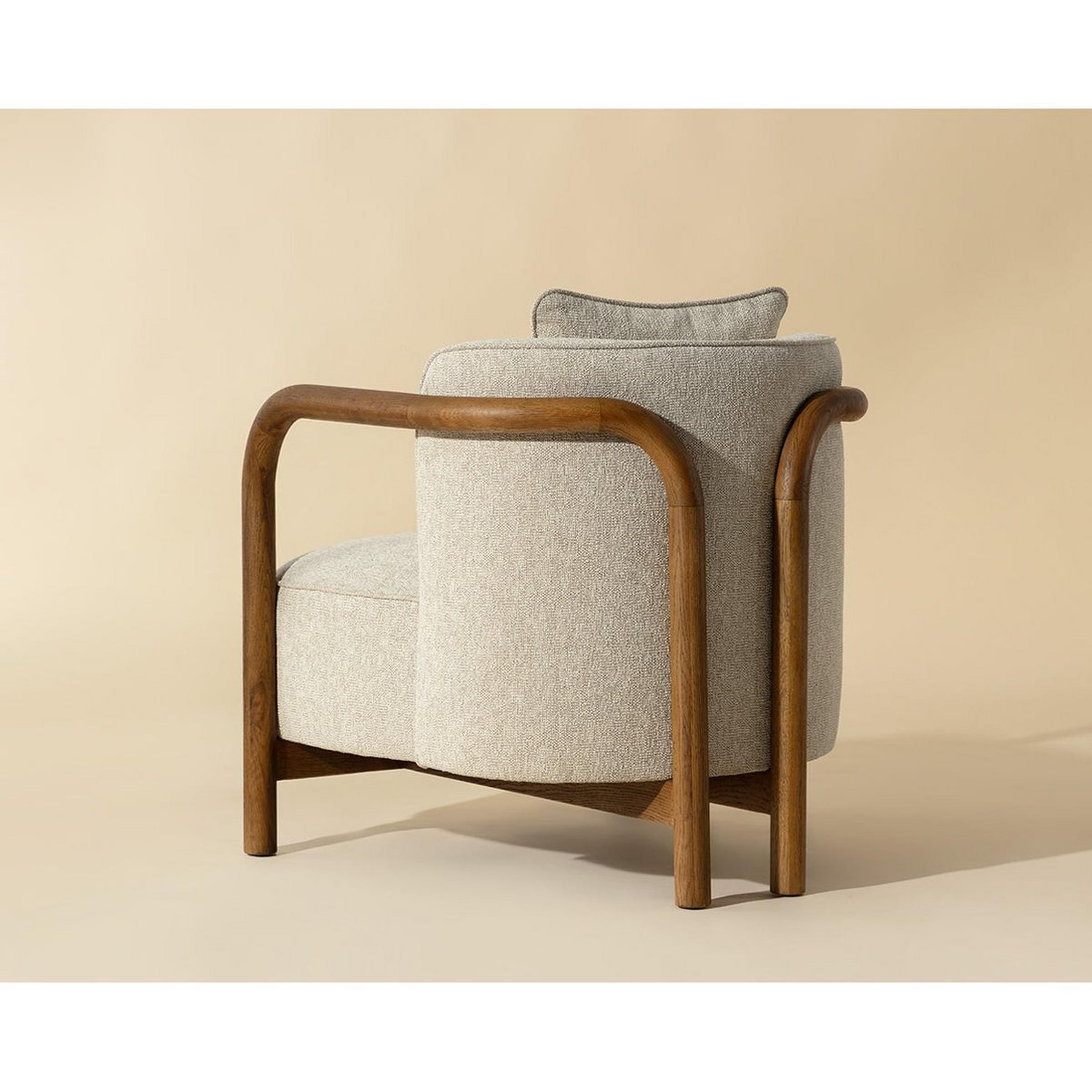 This accent chair combines plush feather and foam cushioning with a solid pine wood frame. The rounded armrests and deep seat provide a lush spot to lounge while reading or snuggling with a pet.