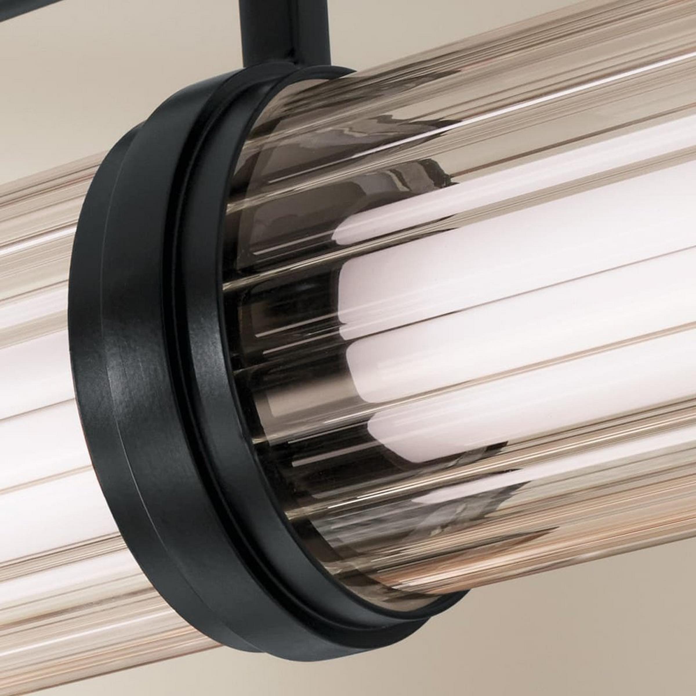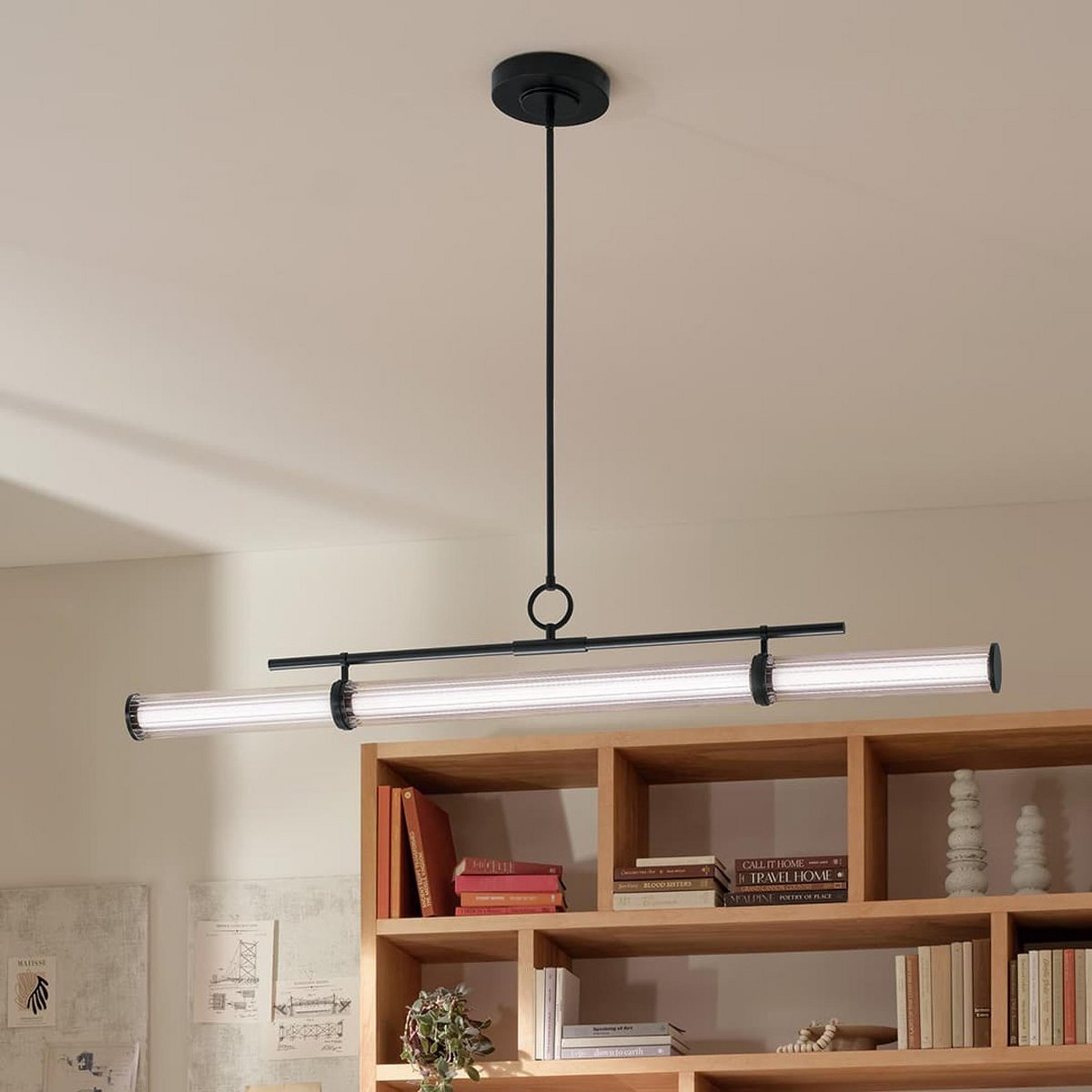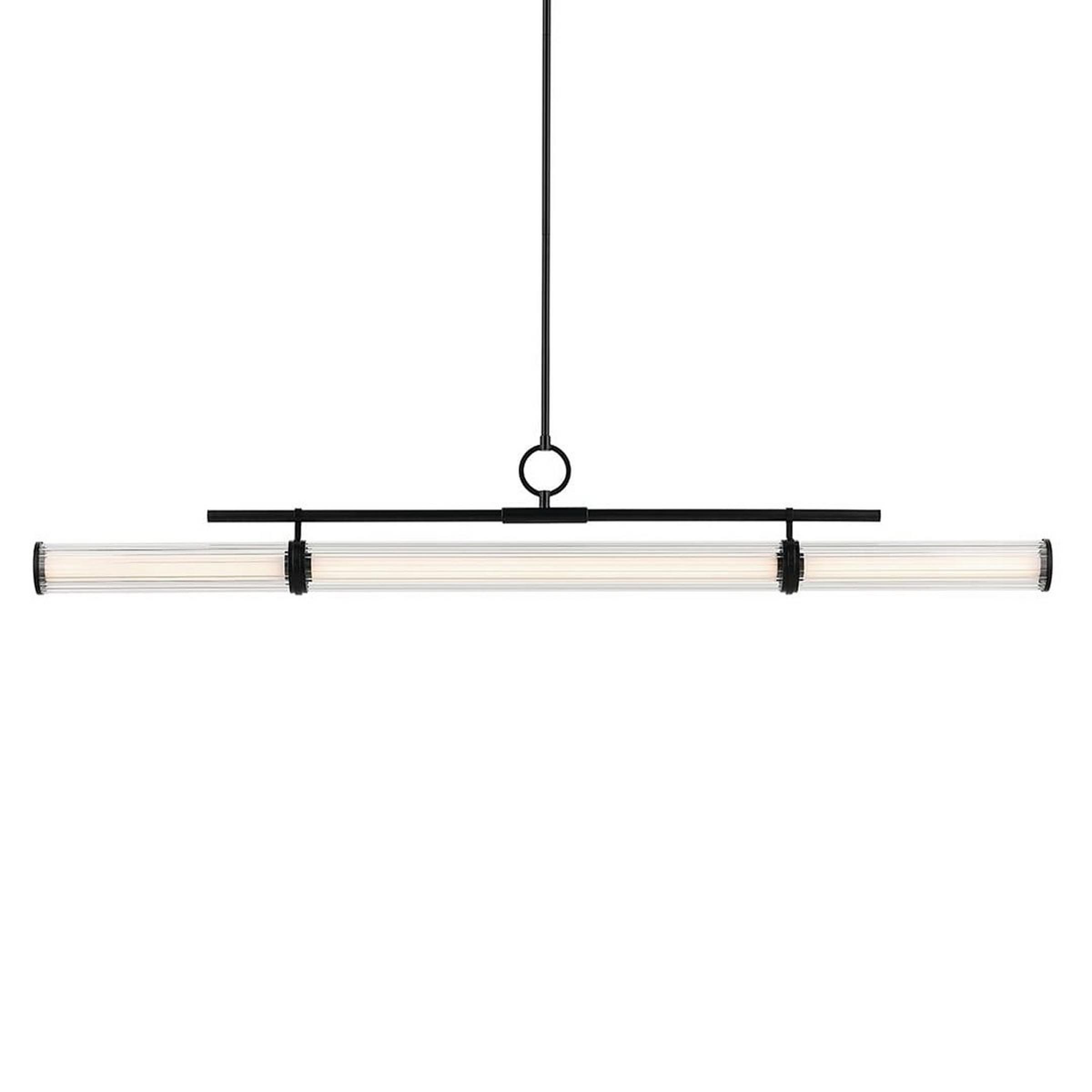 The visually striking light bar and decorative hardware take center stage in this linear chandelier as it appears to balance and float in space. Fluted glass refracts light along the length of the chandelier to add further complexity to the piece through the extra layer of texture.