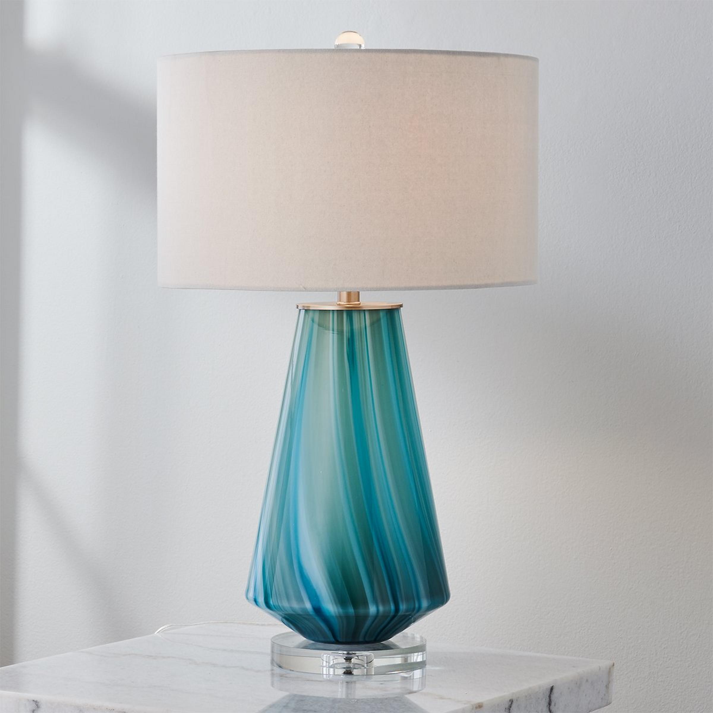 This elegant table lamp features a glass body with a distinctively geometric silhouette. Bold yet delicate, it makes a bright accent in any modern space.