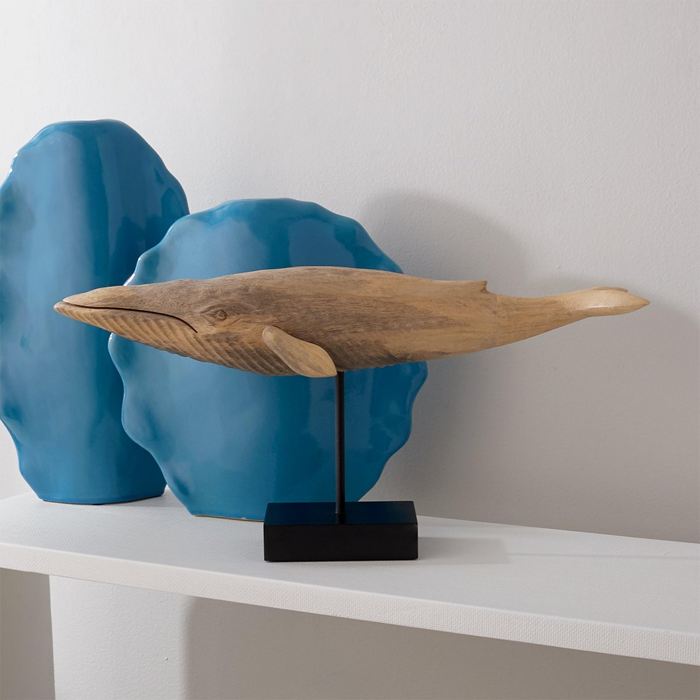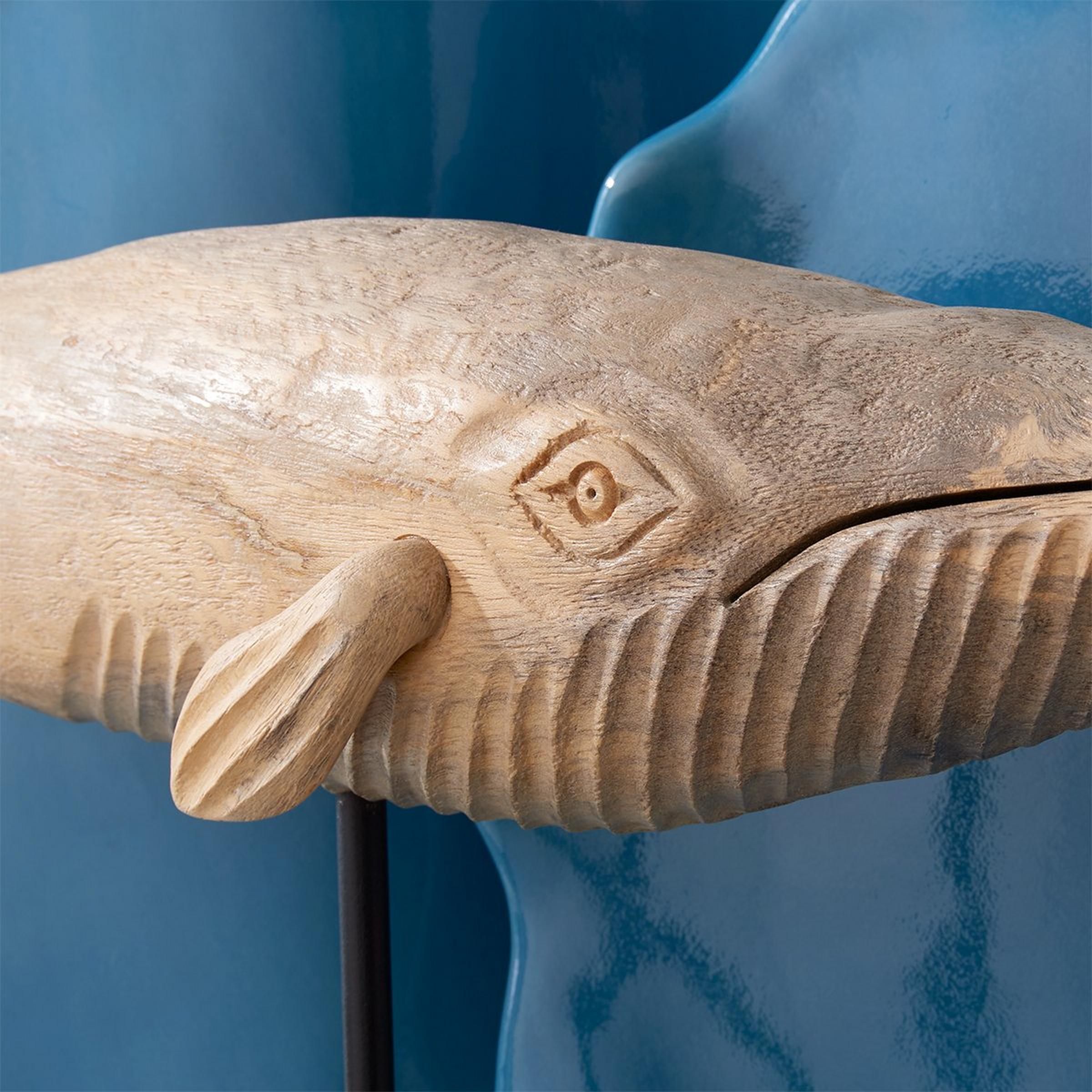 Ahoy, matey! This fun sculpture brings a hint of the sea to any space, whether you're decorating your landlocked abode or a coastal cabana. Carved from wood and set atop an iron base, this cute whale is certain to satisfy your inner marine enthusiast. Please note that because this product is made of natural materials, each piece will vary slightly in appearance.