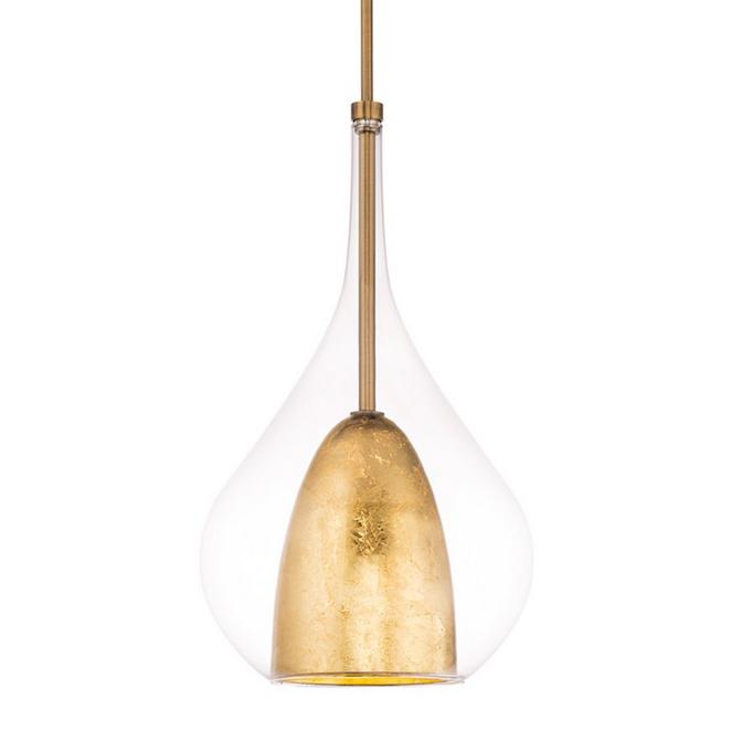 This extraordinary pendant light features a beautifully crafted teardrop glass design. As warm light peaks through the cracks of gold leaf shade, this pendant warms your space like a flickering fire. The combination of the glass and gold leaf creates a luxurious ambiance, making it a striking centerpiece for any space.