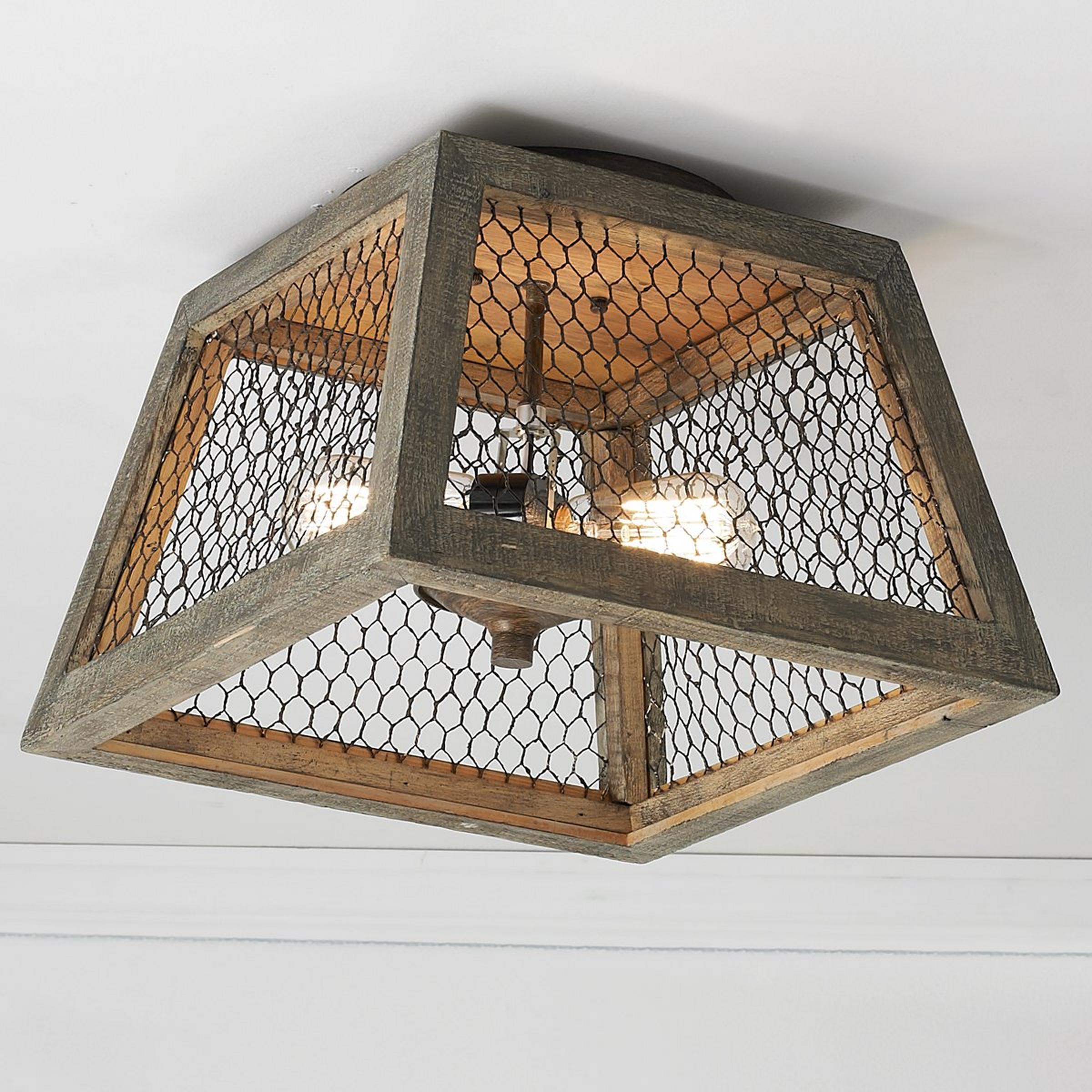Weathered wood and chicken wire ceiling light blends the vintage charm of rustic French villas with today's love of geometric shapes.