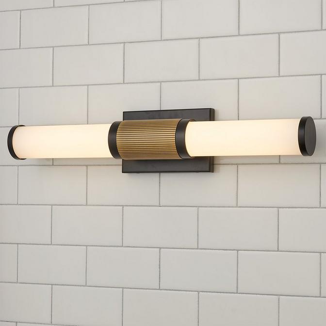 The dual finishes of Chiron create a distinct and balanced look. Effortlessly chic, the ribbed cuff contrasts the soft opal glass to compose a vanity light that complements any space.