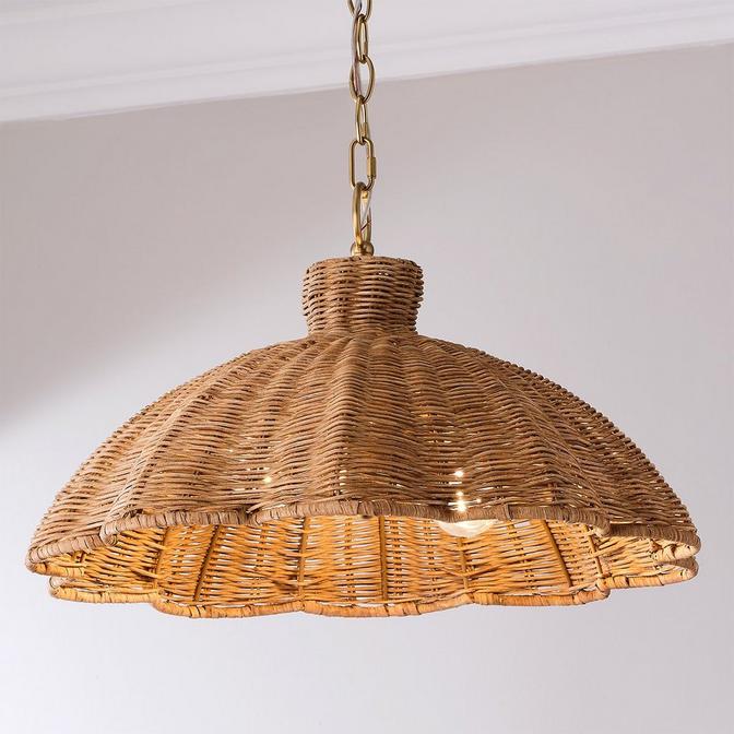 Bold yet versatile, classic yet new, trendy yet timeless: the Chris Loves Julia lighting collection embodies everything we love about home design duo Chris and Julia Marcum's distinctive modern traditional style. This exclusive collaboration between Chris Loves Julia and Shades of Light features traditional designs updated with Julia's fresh, inspired style in a range of signature colors and classic materials hand-selected to elevate the drama in any room. The Greta Line marries sleek metal with organic rattan for a relaxed vibe that evokes classic coastal style. Each scalloped shade is hand-woven for an artisanal feel, adding a touch of whimsy to any room.