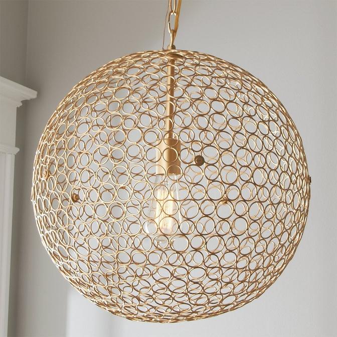 Steel rings form a lightweight metal mesh globe around a central lamp for a delicate statement fixture. This simple, modern lantern with a geometric pattern will add a timeless sophisticated touch to any decor. This exclusive Shades of Light design comes in multiple sizes and finishes to coordinate in different areas or create an artistic mix in a kitchen, bedroom, or dining room.