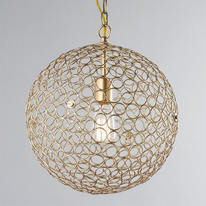 Steel rings form a lightweight metal mesh globe around a central lamp for a delicate statement fixture. This simple, modern lantern with a geometric pattern will add a timeless sophisticated touch to any decor. This exclusive Shades of Light design comes in multiple sizes and finishes to coordinate in different areas or create an artistic mix in a kitchen, bedroom, or dining room.