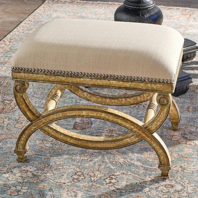 A celebration of artistry and refined elegance, the Claude X-Bench is a statement piece designed for interiors that demand distinction. With its hand-carved wooden frame finished in distressed antique gold and a plush upholstered seat trimmed in metallic nailheads, this bench evokes the grandeur of European salons. Claudex’s intersecting arches and scrollwork lend architectural sophistication. The aged patina highlights the intricate curves and rosette accented frame is complimented by the luxe linen blend fabric offering a soft, tailored seat. Ideal for entryways, dressing rooms, or as a refined foot-of-bed accent. The Claudex bench is more than seating—it’s a curated expression of timeless luxury, crafted for those who appreciate the art of living beautifully.