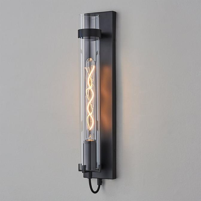 This sconce mixes modern and vintage styles to create a unique piece to tie your space together. Featuring a clear glass shade held by durable prongs, this fixture adds to its own character with a ridged fitter inside of the shade and a subtle, yet tasteful cord at the bottom.