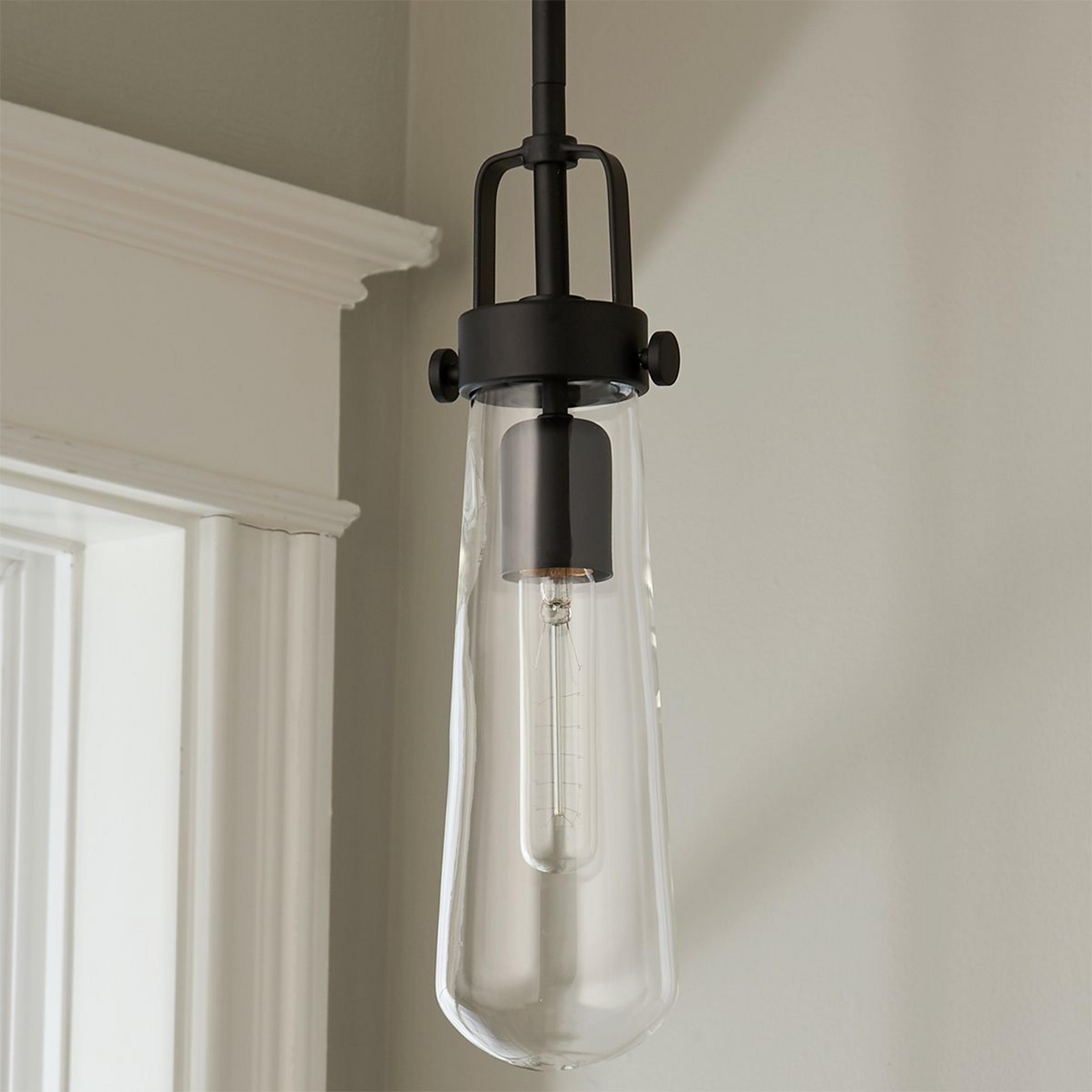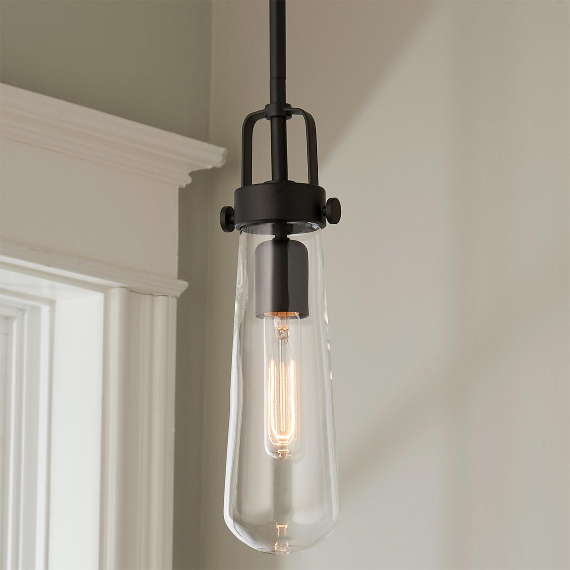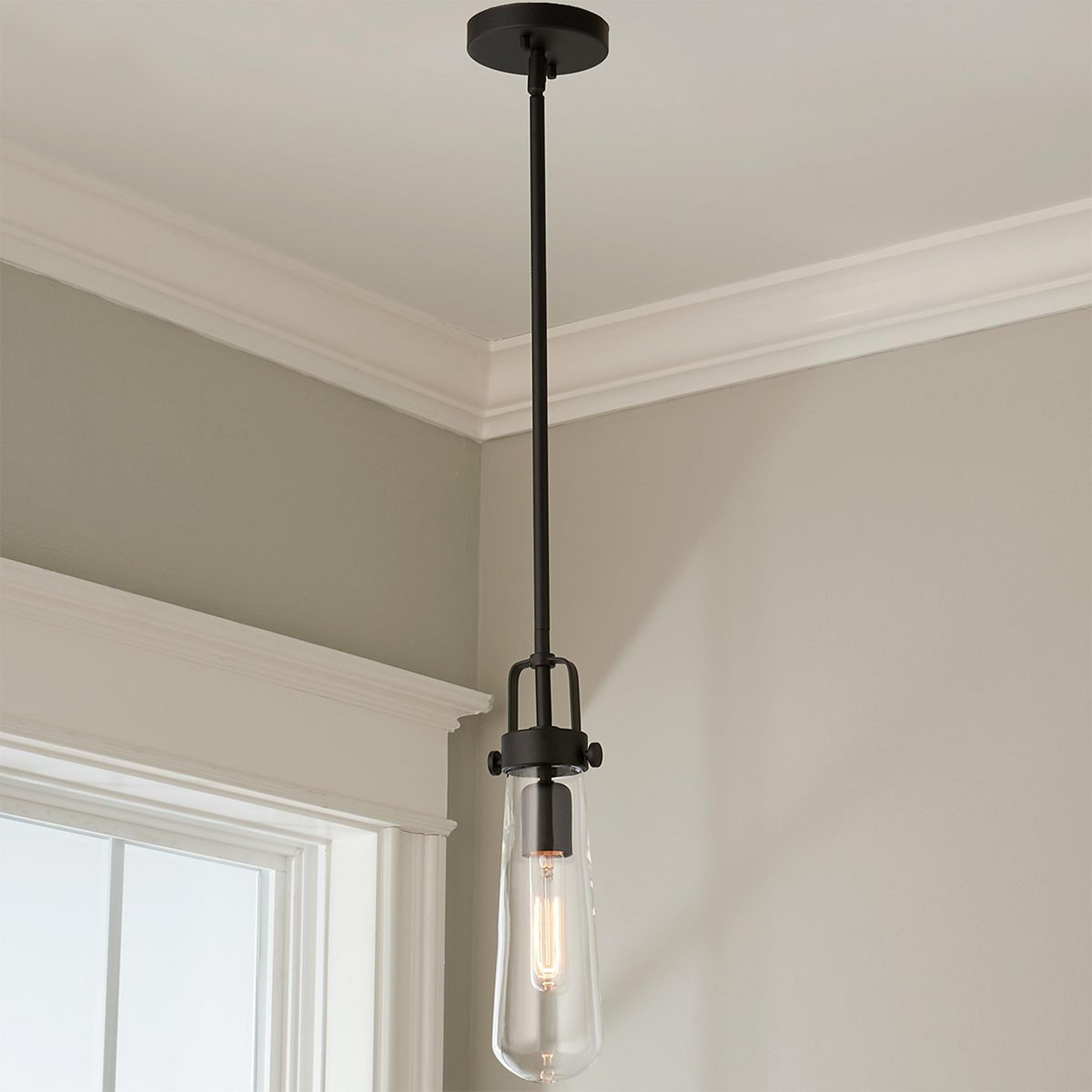 Blending modern aesthetic with industrial-chic design, this hanging pendant light has a sleek clear glass vial-shaped glass suspended by a Brushed Nickel or Blackened Bronze industrial bracket.