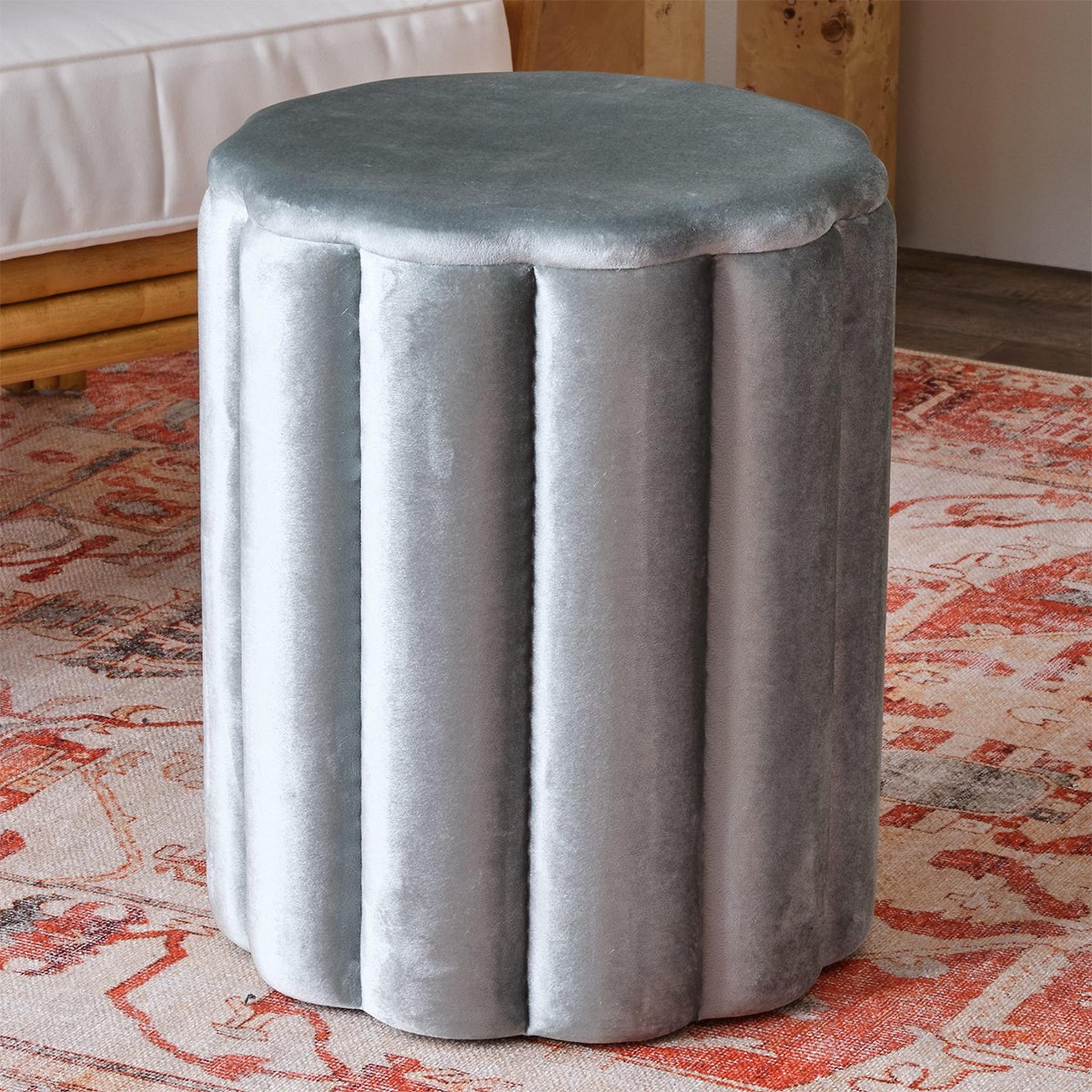 The Clover Ottoman is a small stool with a big personality. The unique scalloped shape is upholstered with velvet and has vertical channel tufting that adds a luxurious touch to its design. The ottoman is a great addition to any room that needs extra seating or a stylish accent piece.