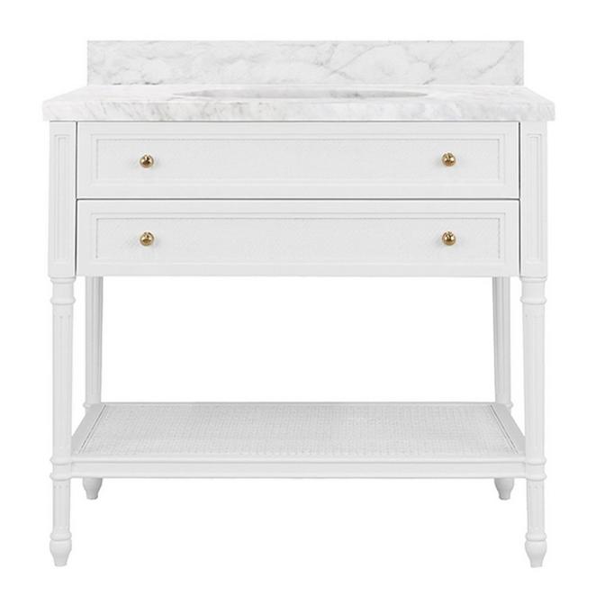 The open storage underneath this classic vanity lends an airy, tidy appearance to the home, and the grasscloth shelf also proves itself to be a functional place to store clean towels and linens. Thoughtfully designed, this piece revives and furthers the legacy of classic furniture through accents like recessed drawer fronts, dainty metal pulls, and spindle legs. The 1 1/4" marble countertop further emphasizes the deluxe feel of the piece. Due to the qualities of natural marble, each piece will vary in tone and grain of the stone. No two will be alike, as each one is celebrated as one-of-a-kind.