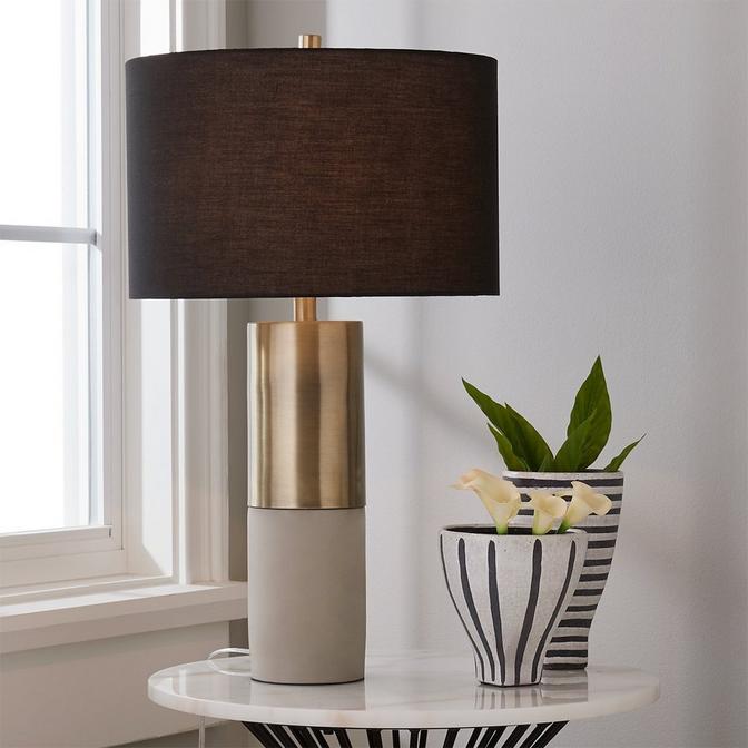 Define your space with the decadence of this modern cylinder table lamp. The steel and concrete base flaunts a gold metal finish for a luxurious look. A dramatic black fabric drum-shaped shade complements the base. The 72-inch clear cord provides plenty of length to place the lamp in your living room or bedroom for extra light, while a switch located on the socket allows you to easily turn the light on and off.