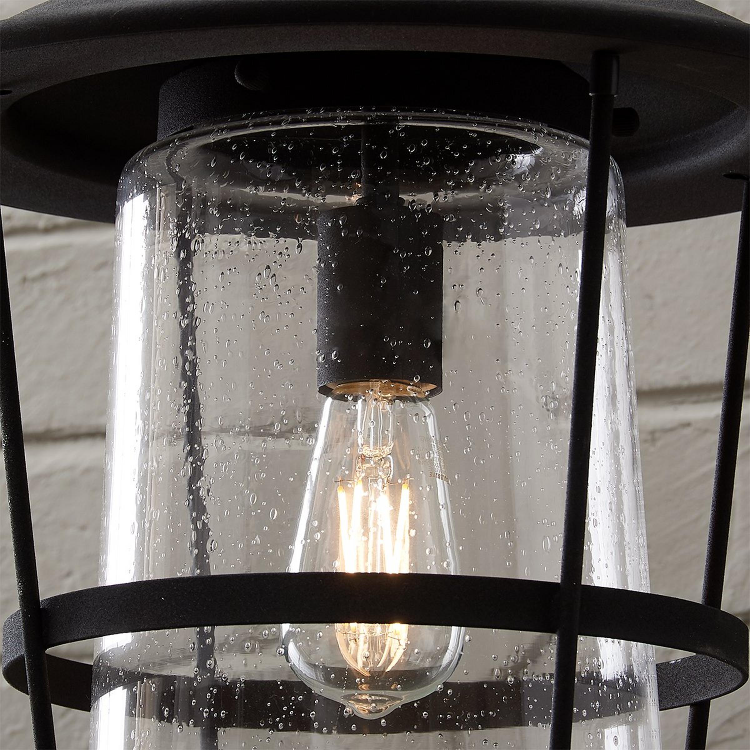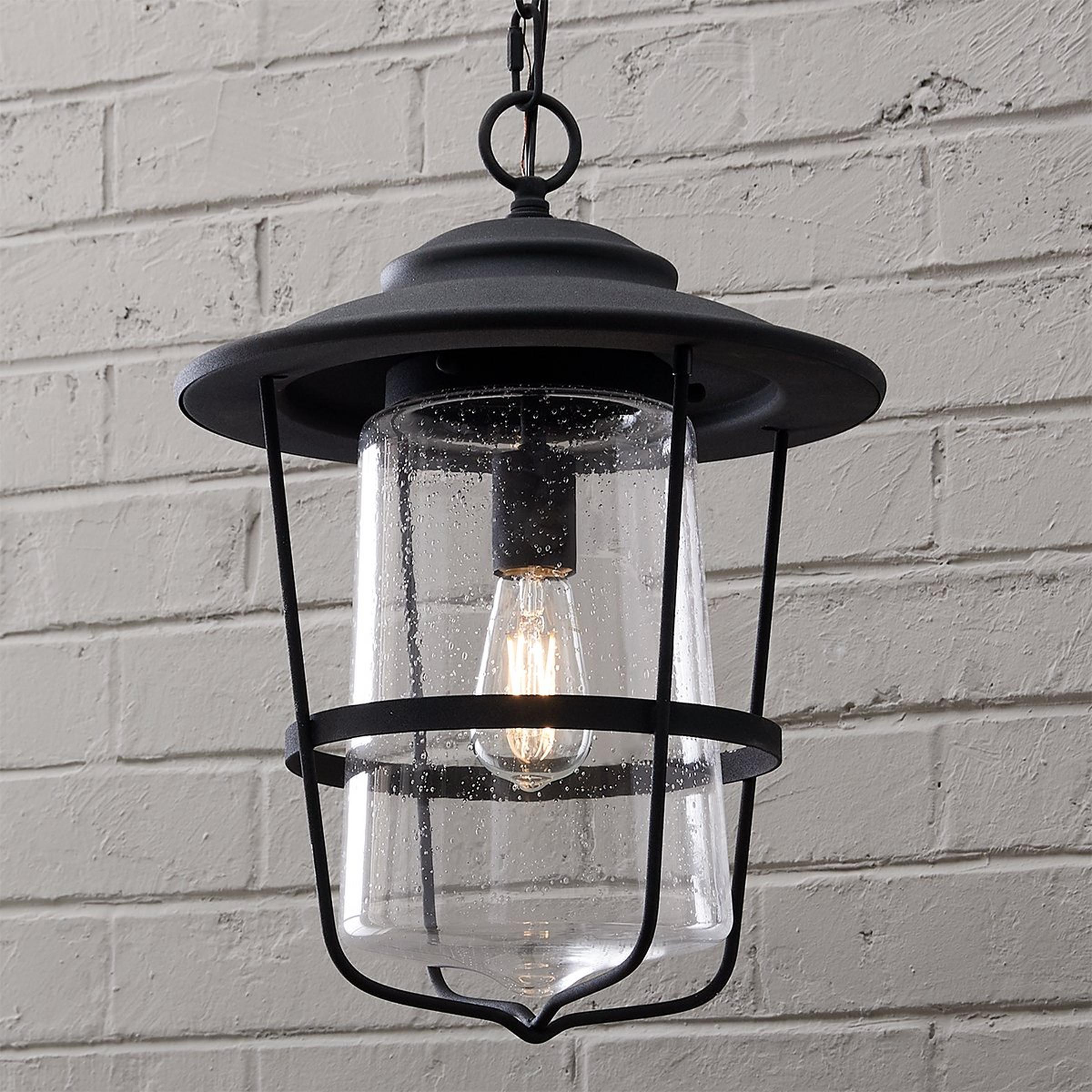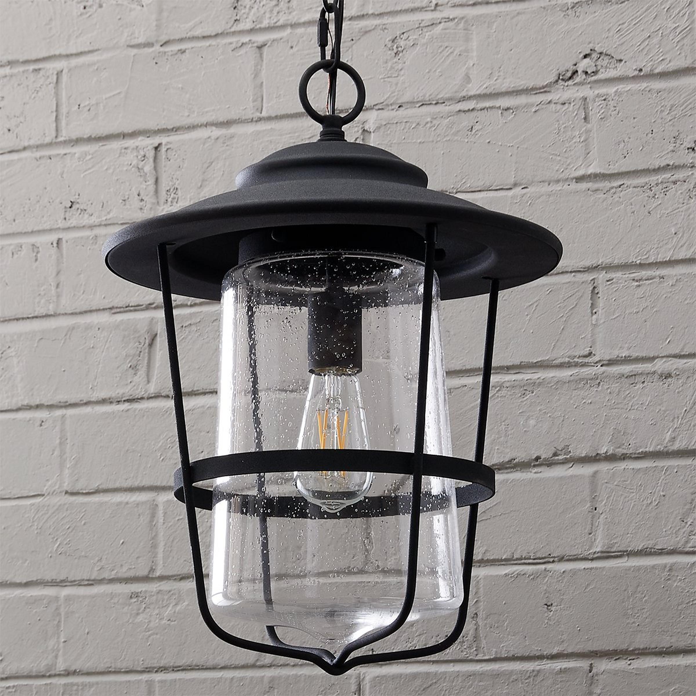 This beautiful outdoor hanging lantern features a refined double flare design, with a seeded glass shade that flares at the bottom nested within a metal frame that flares at the top. Available in Black and Old Bronze finishes. 1x100 watt max medium base socket. (17.5"Hx13"W). Canopy (1"Hx5"W). Supplied with 3' of chain and 5' of wire. OAH 54" max.