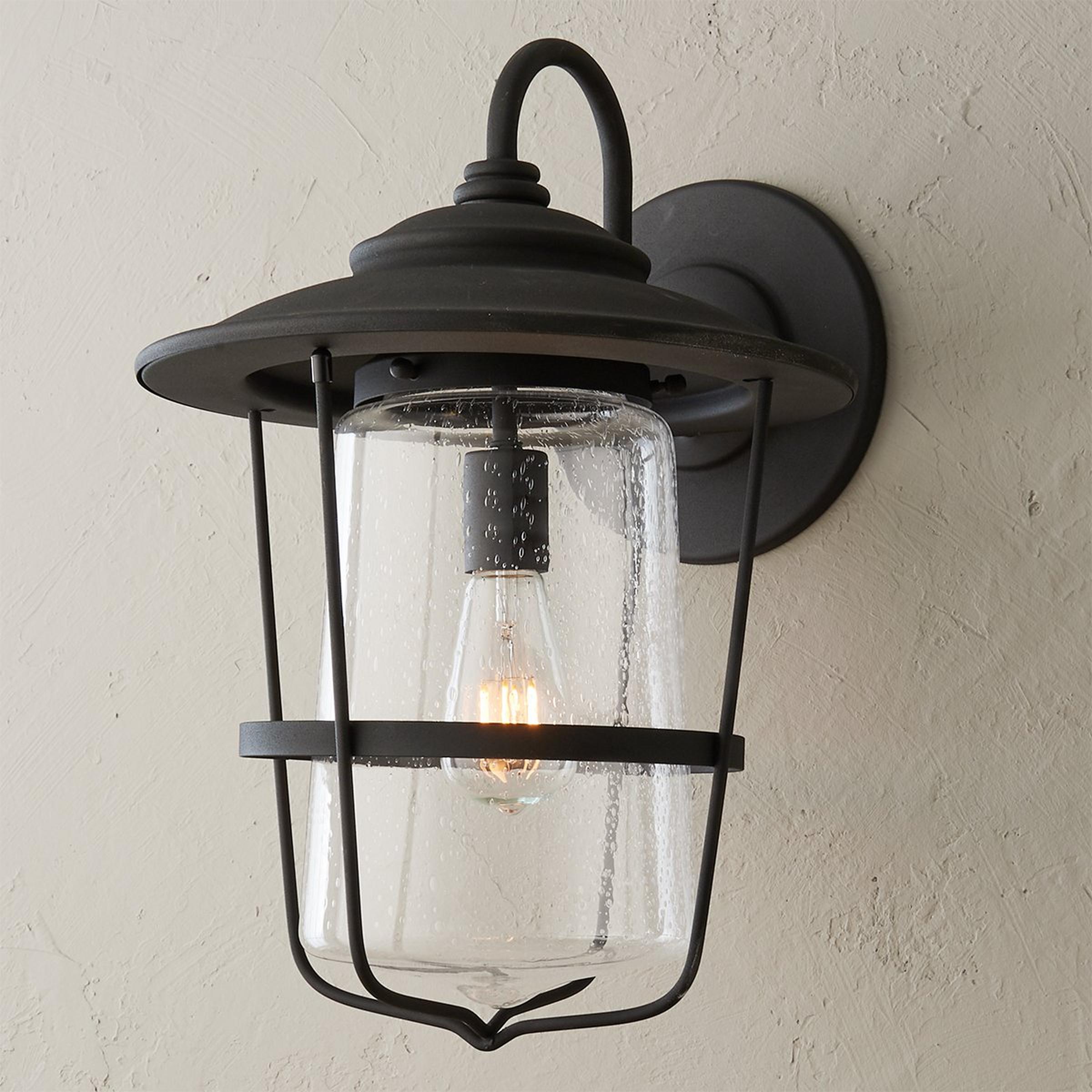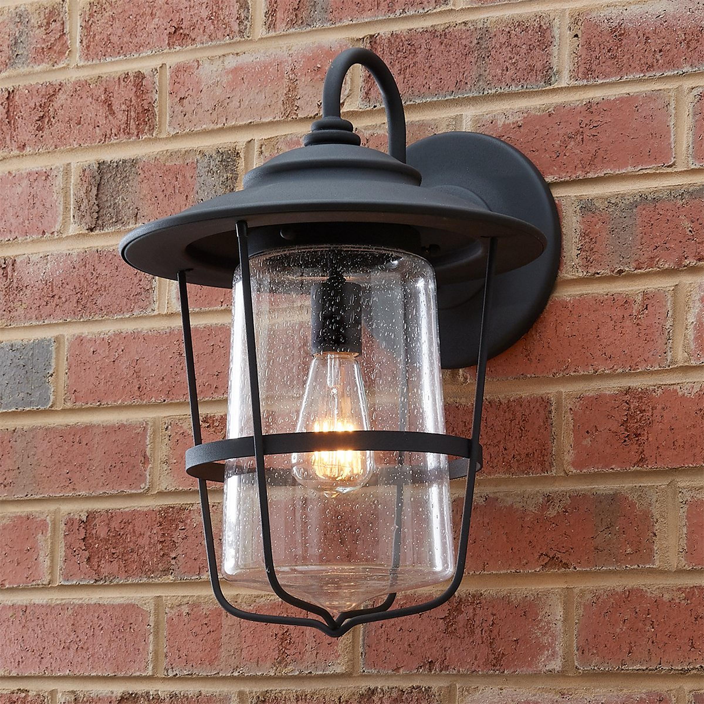This beautiful outdoor lantern features a refined double design, with a seeded glass shade that flares at the bottom nested within a metal frame also flaring at the top.