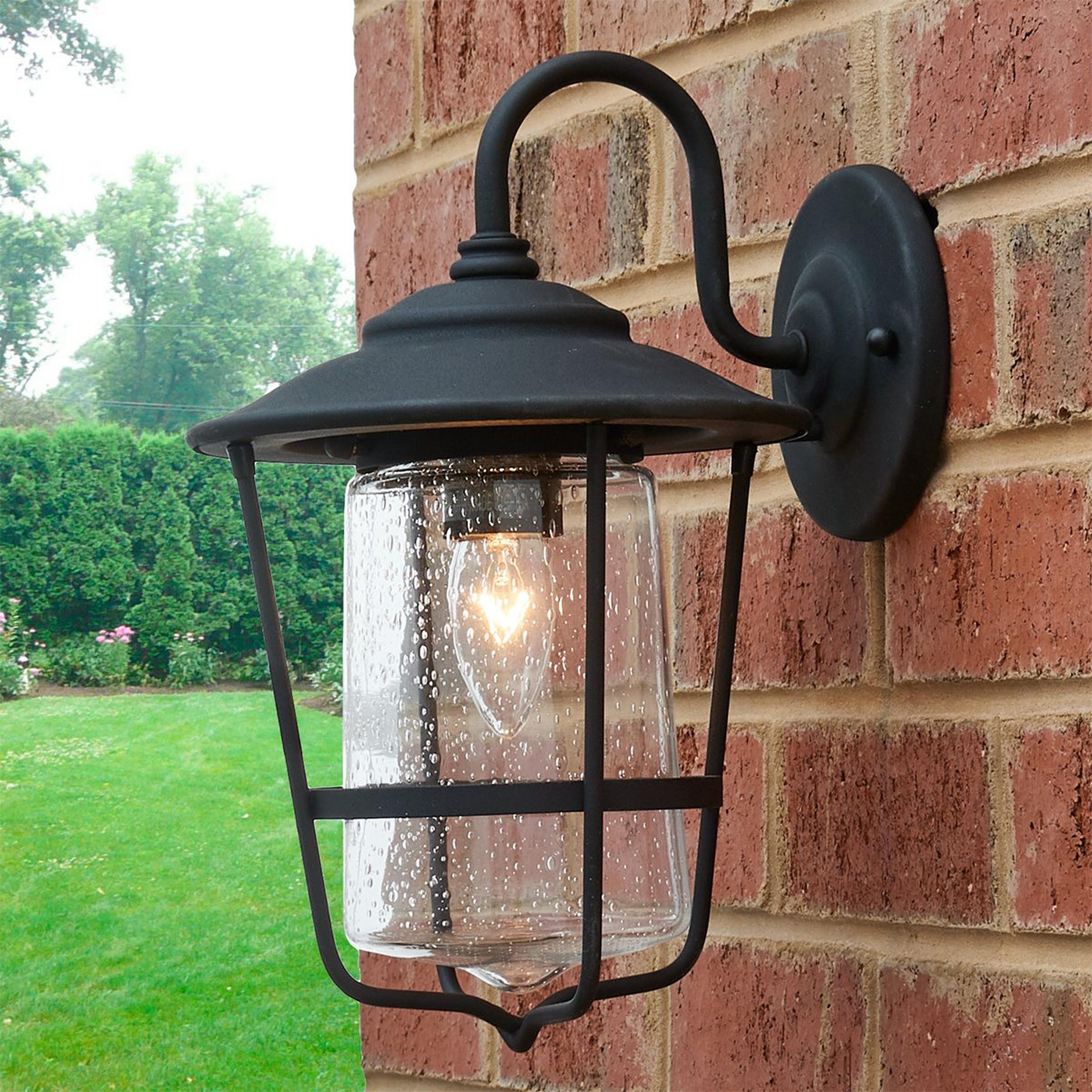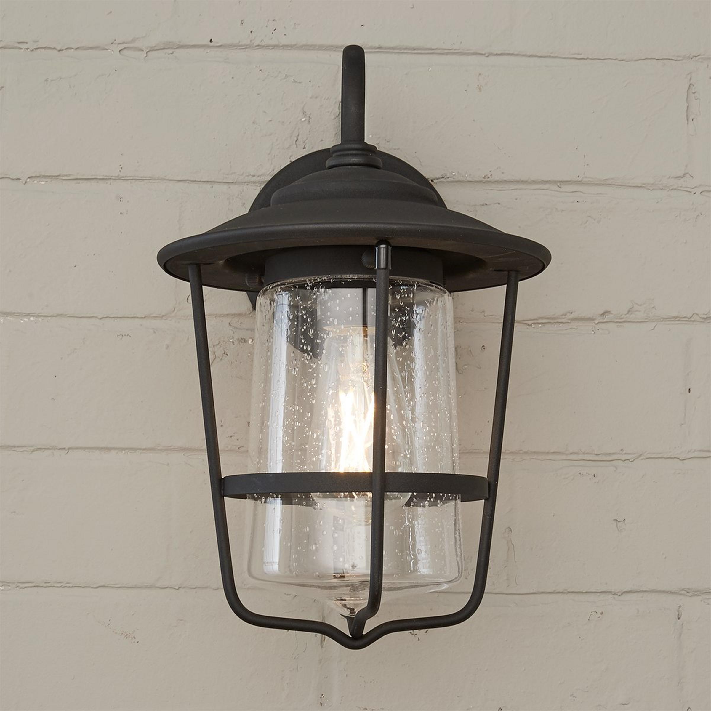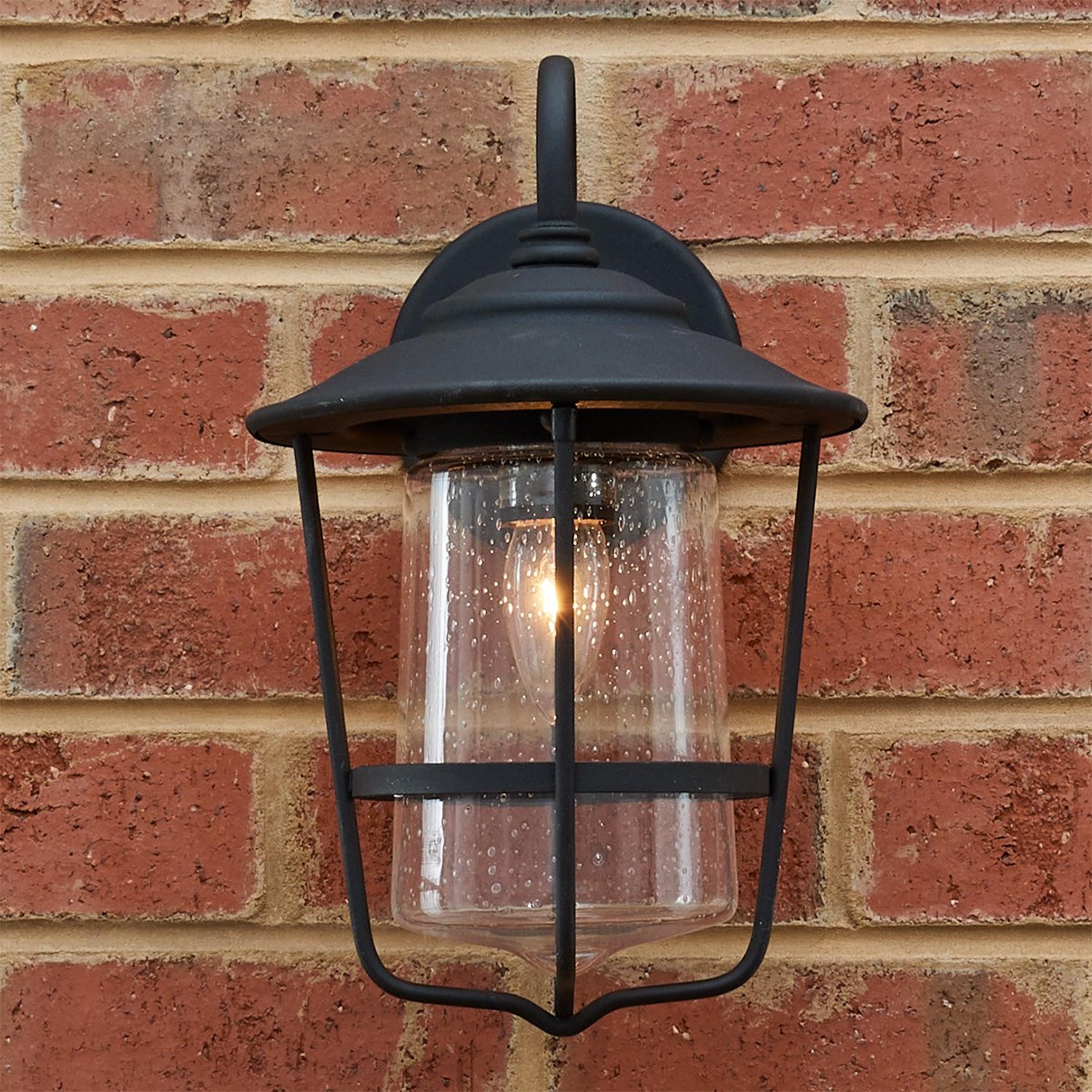 This beautiful outdoor lantern features a refined double design, with a seeded glass shade that flares at the bottom nested within a metal frame also flaring at the top.