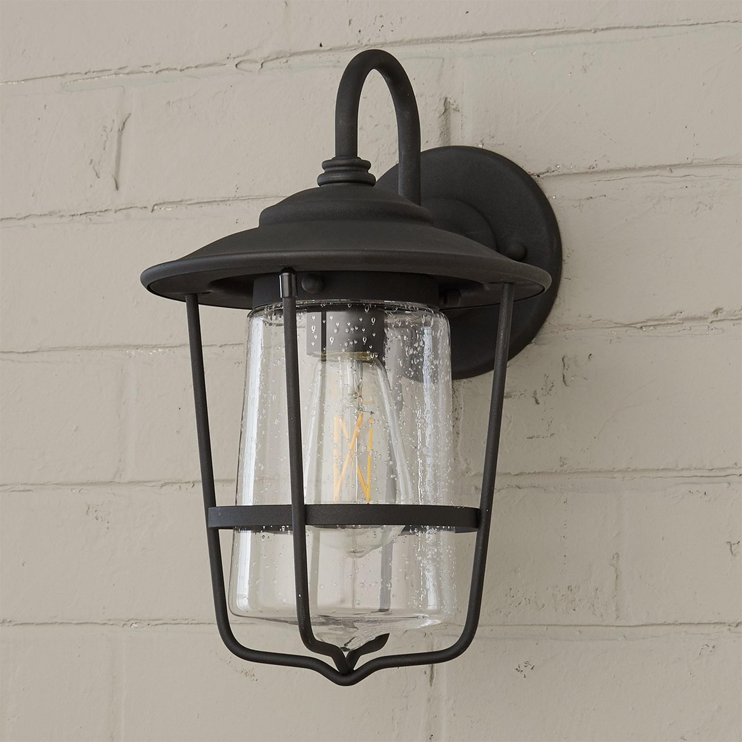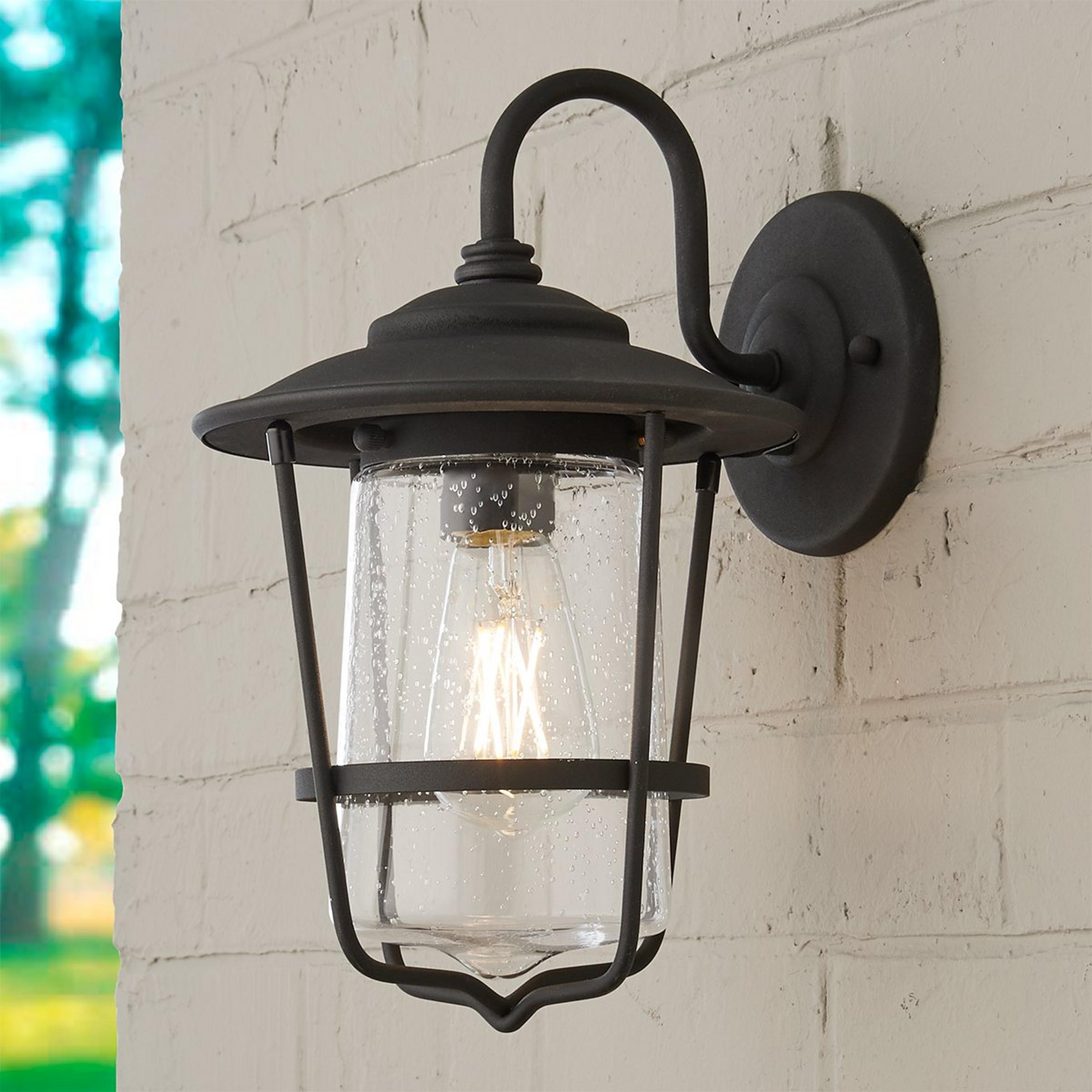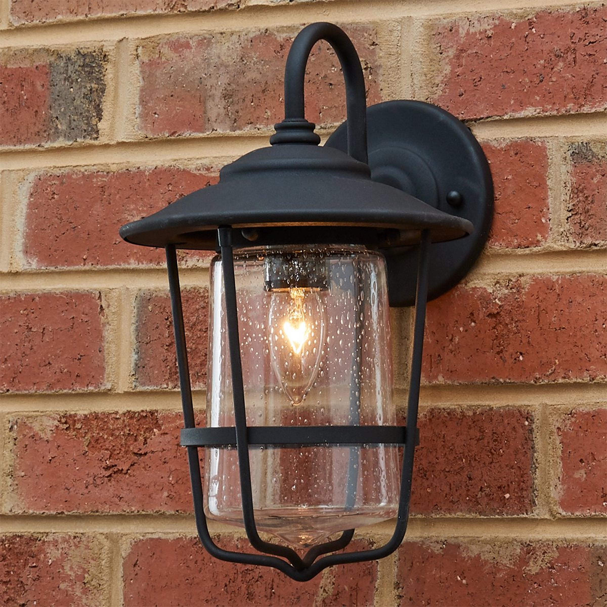 This beautiful outdoor lantern features a refined double design, with a seeded glass shade that flares at the bottom nested within a metal frame also flaring at the top.