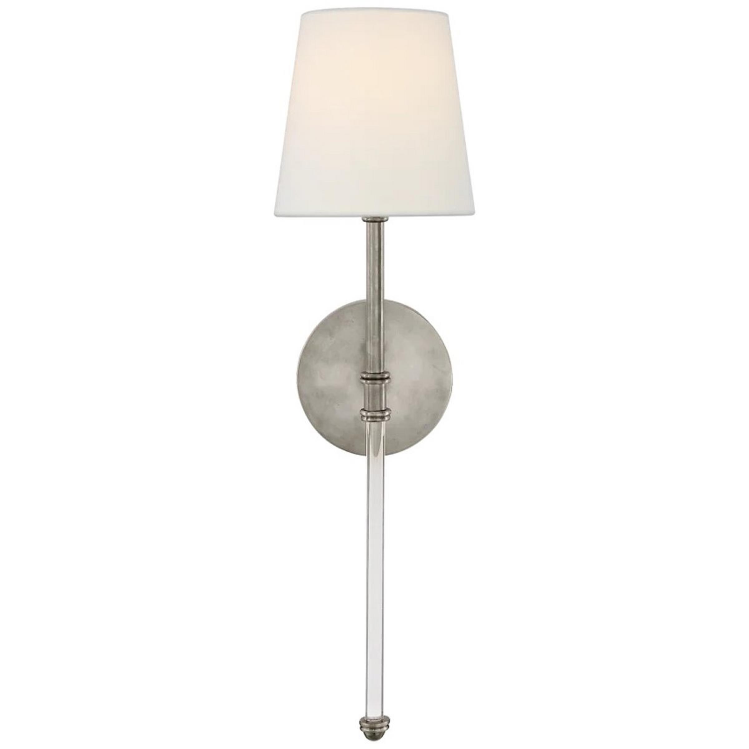 A simple and elegant rod of metal and acrylic pairs beautifully with a round backplate and a linen shade in this refined minimalist sconce perfect for a modern, contemporary, rustic, or classic space.