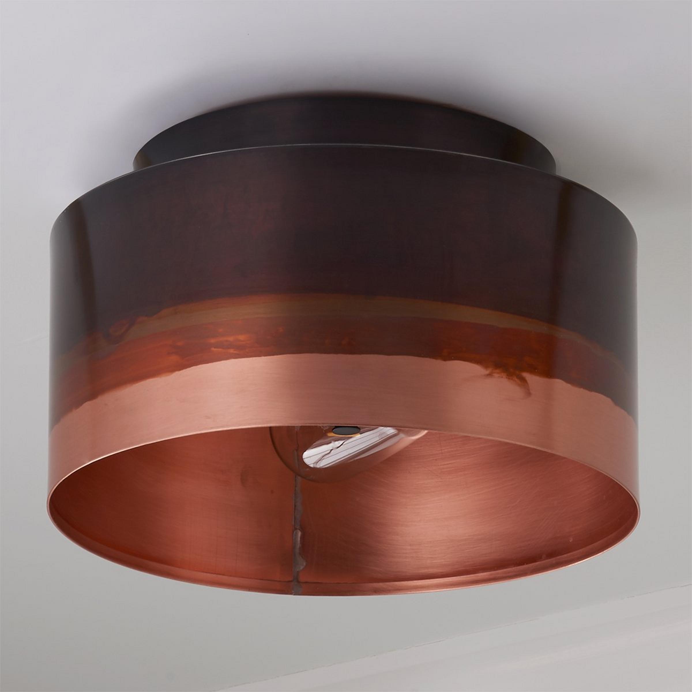 Raw copper with a hand applied ombre finish gives this ceiling light a sophisticated modern and industrial edge. Make a statement by repeating several down a hallway or using it in a bedroom. This ceiling light is made in Richmond, Virginia by our team of in house local artisans from a rolled and soldered sheet of Raw Copper. Due to the nature of this hand applied finish no two will be exactly alike in color or pattern.