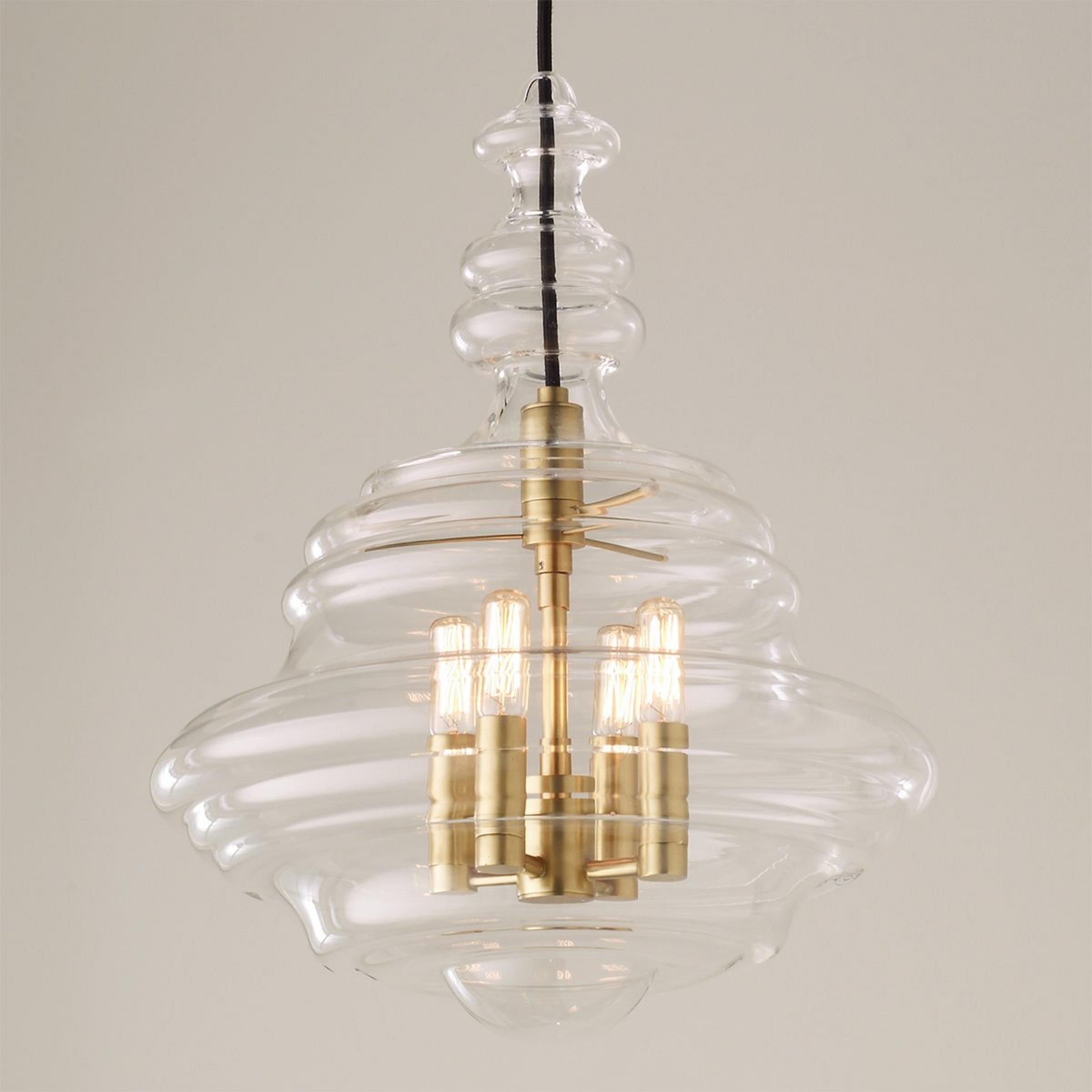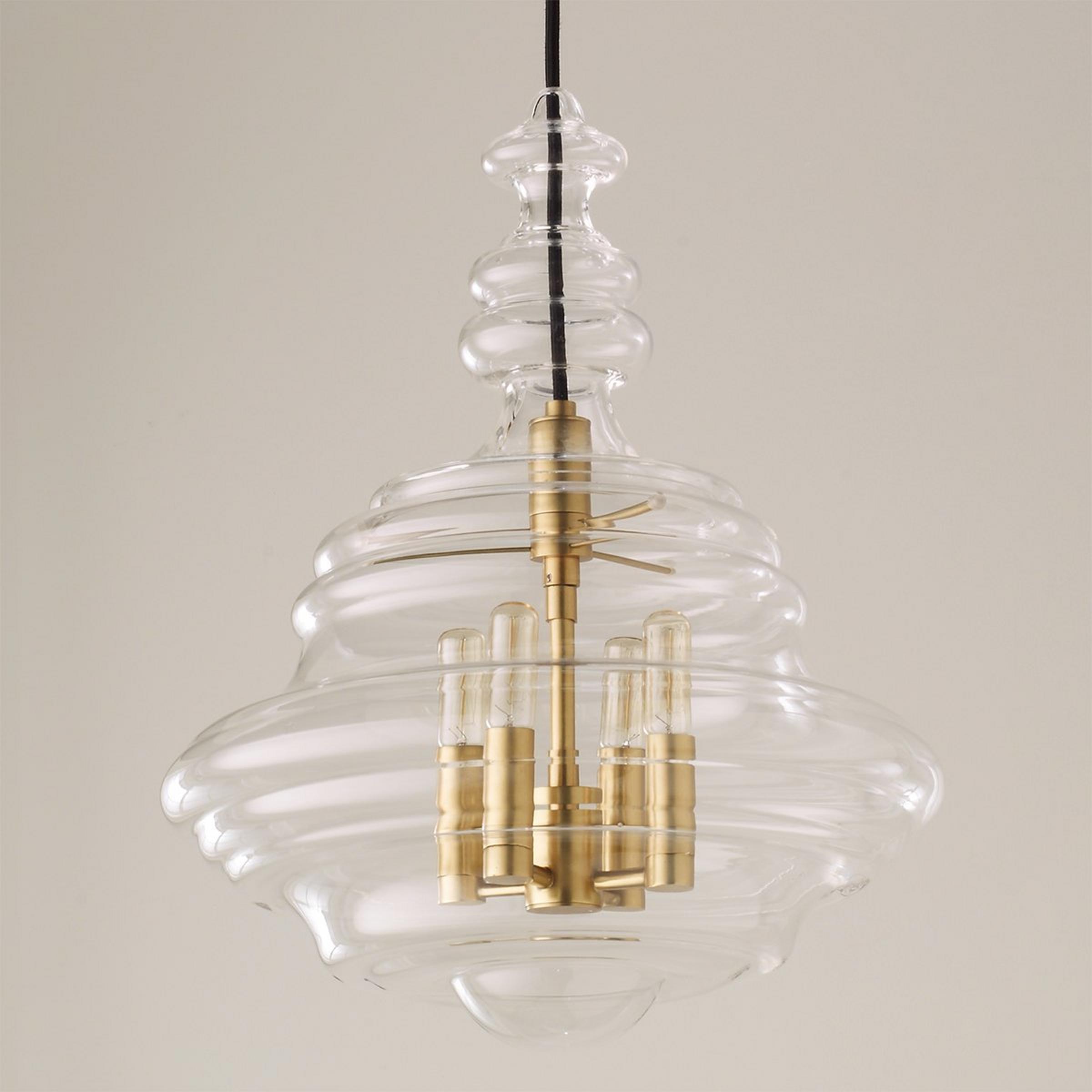 This ornate chandelier was crafted by a team of skilled artisans. Molten glass is worked into a paste mold by the artisan while being simultaneously turned by an assistant. The result is an elaborately shaped glass of pristine clarity.