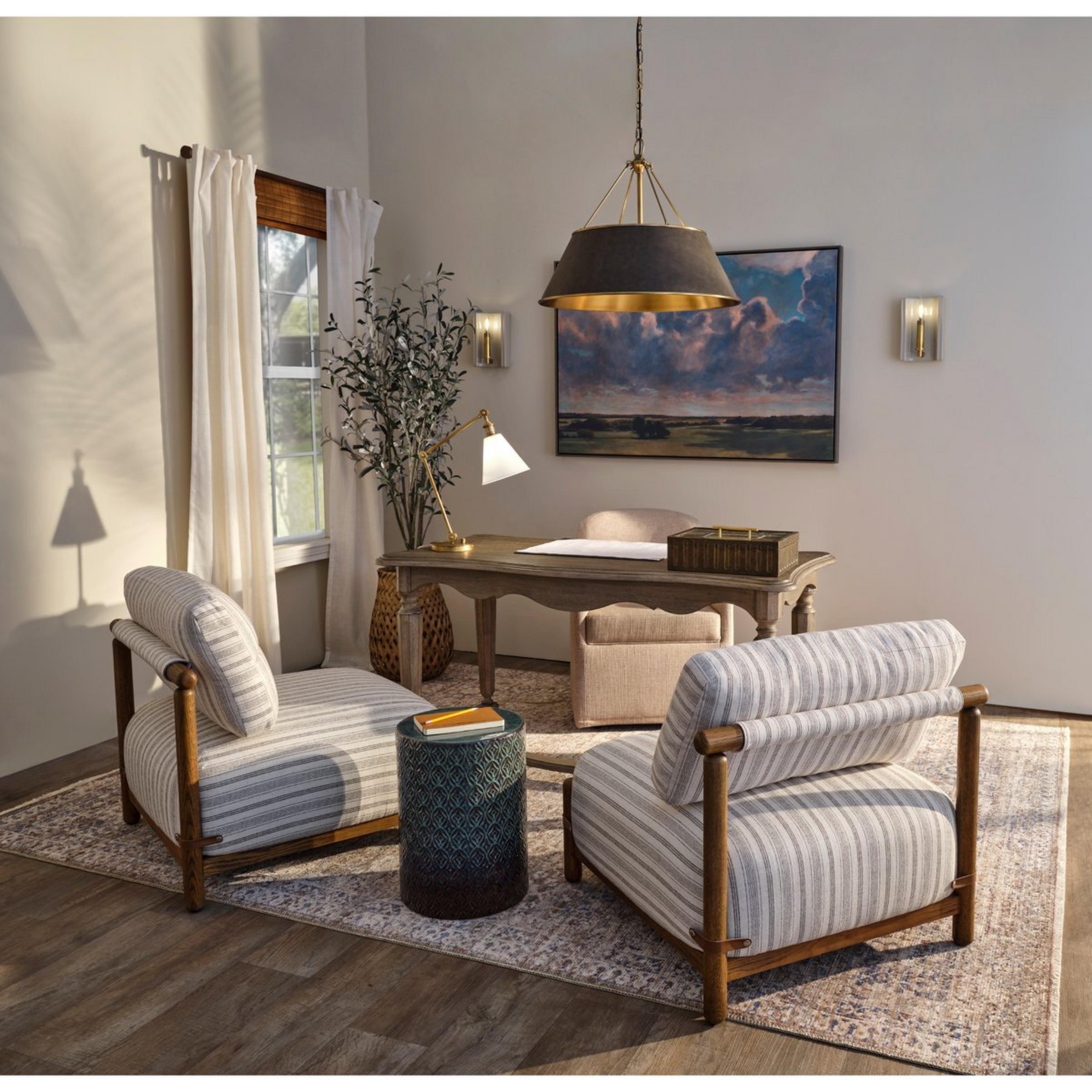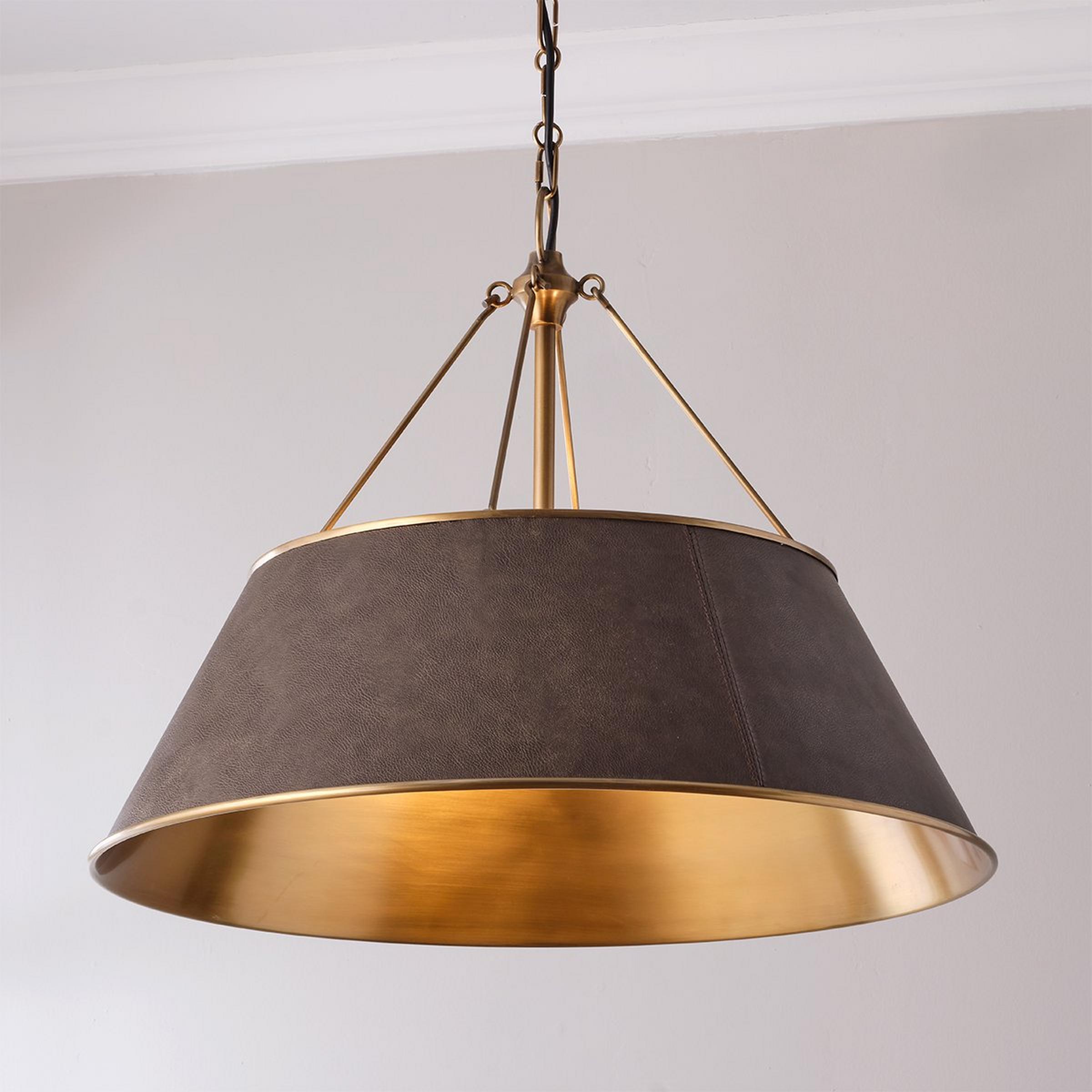 Perfectly at home in the most tradtional library or in a modern farmhouse kitchen over a table and banquette. Leather wrapped and accented with brass, this lush, warm shade chandelier brings an undeniable warmth where ever it is used.