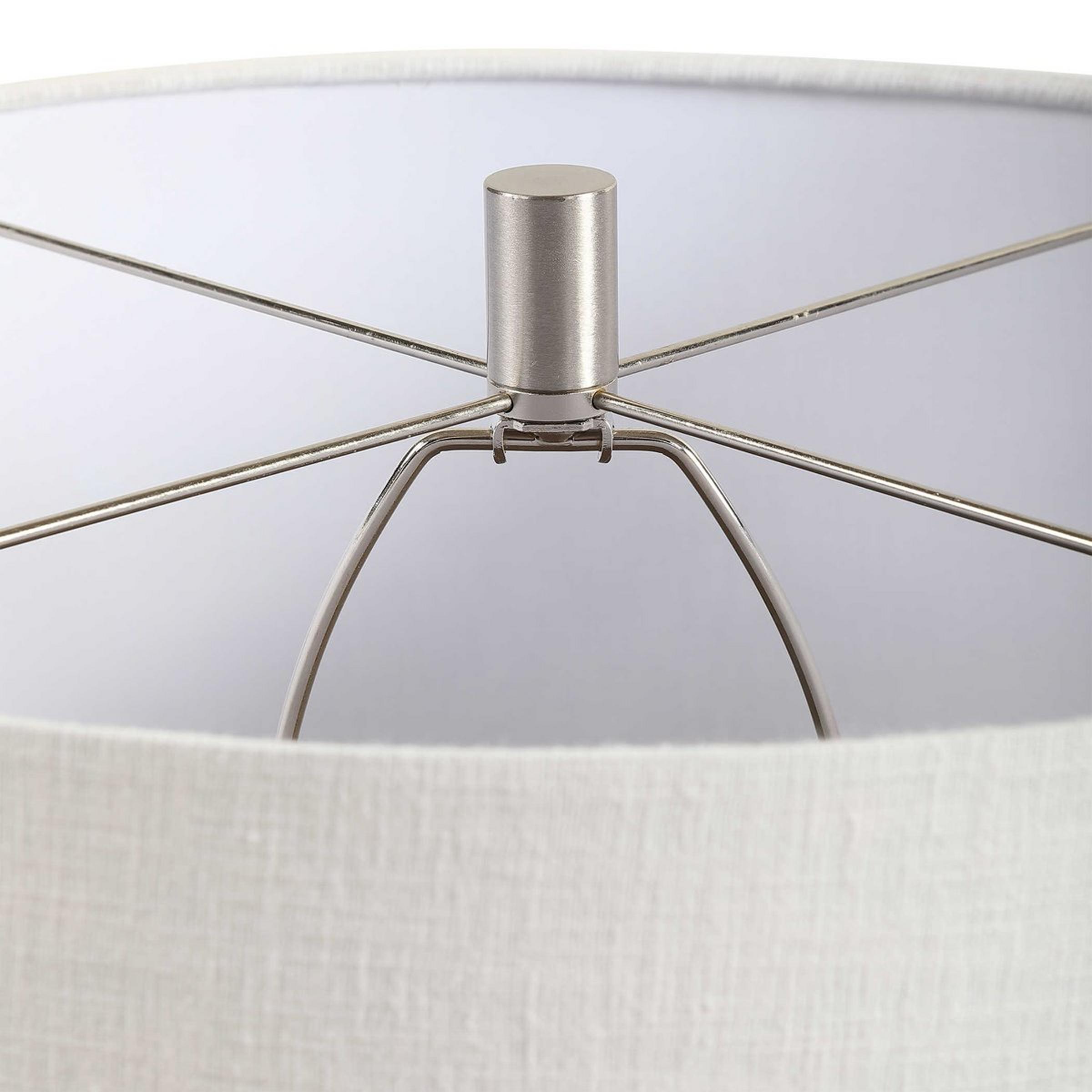 Artistic geometric details and a glossy glazed finish make this table lamp a trendy eclectic addition to your space. Topped with an off-white linen drum shade and brushed nickel hardware, this piece will add the perfect pop of color to your interior.
