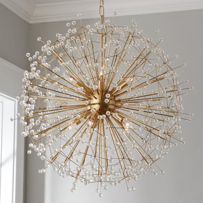 This sparkling chandelier effortlessly merges glamour and whimsy. The crystal bedazzled stems branch into a glittering globe reminiscent of dandelion seed heads, snowflakes, and twinkling stars all at once.