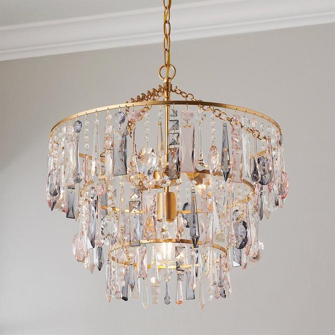 Lavish and decadent, this chandelier combines hand-cut crystals of varying warm pastel tints - clear, smoke, and blush - to become a multifaceted masterpiece. Its powerful tiered format makes a confident statement while its soft glistening gems range from teardrops and ovals to studs and jewels. Fine details, such as a dainty chain that connects the ring of crystals to the central rod, further augment effects that can tie a room together.