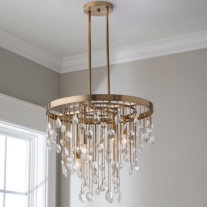 A glamorous showstopper, the Crystal Spring Chandelier creates lots of glimmer with faceted crystals suspended around the lamps. This chandelier speaks in shimmer and silhouette. Suspended from a minimalist ceiling mount, its circular brass frame anchors a waterfall of vertical rods, each tipped with a clear crystal droplet. The result is a radiant composition—light refracted, multiplied, and softened into a dance of brilliance. Designed for rooms that crave both drama and beauty. Whether centered above a dining table or gracing a grand foyer, it delivers presence without excess, and elegance without ornament.