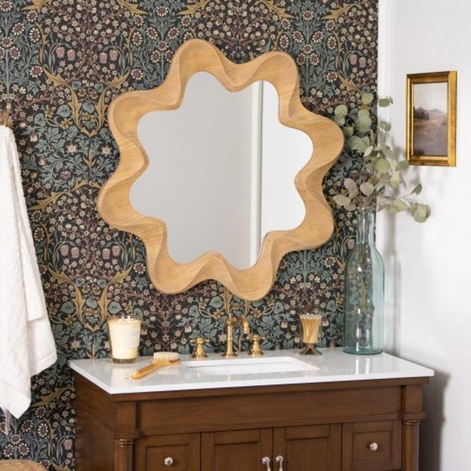 Like a burst of sun rays or a blooming flower, this bold mirror is sure to spice up a bathroom, living room, or dining space. The natural wood frame brings in warmth while the unique, sculptural detailing adds dimension and intrigue. The versatile design can accommodate two different installation orientations for added customizability depending on your preferred look. D-ring hardware included.