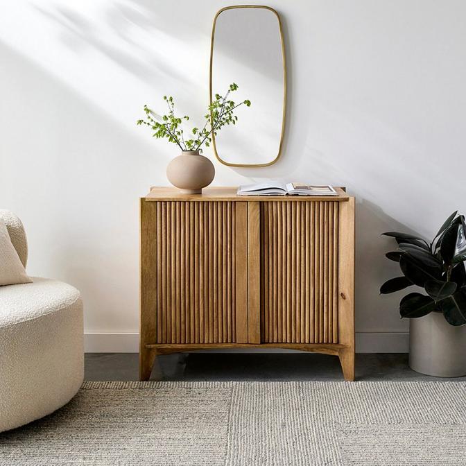The simplicity of this cabinet makes it the perfect storage solution for entryways and other small spaces. Constructed from beautiful mango wood, it boasts a natural finish for an earthy, organic statement. With two textural doors and a storage shelf inside, it sets the right tone in any space. Please note that because this product is made of natural wood, color and finish may vary. Each piece is unique.