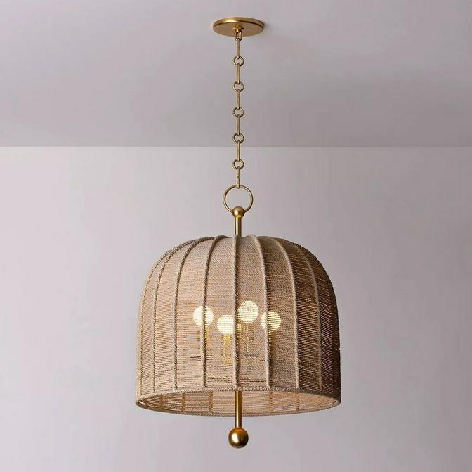 This pendant, made of bleached abaca rope, shrouds a candelabra cluster of bulbs beneath the shade. This blend of glamorous metal finishes and natural materials creates a warm, casual environment for hosting dinner parties under softly lit ambiance. Due to the natural materials used, each piece is unique and may vary in tone.