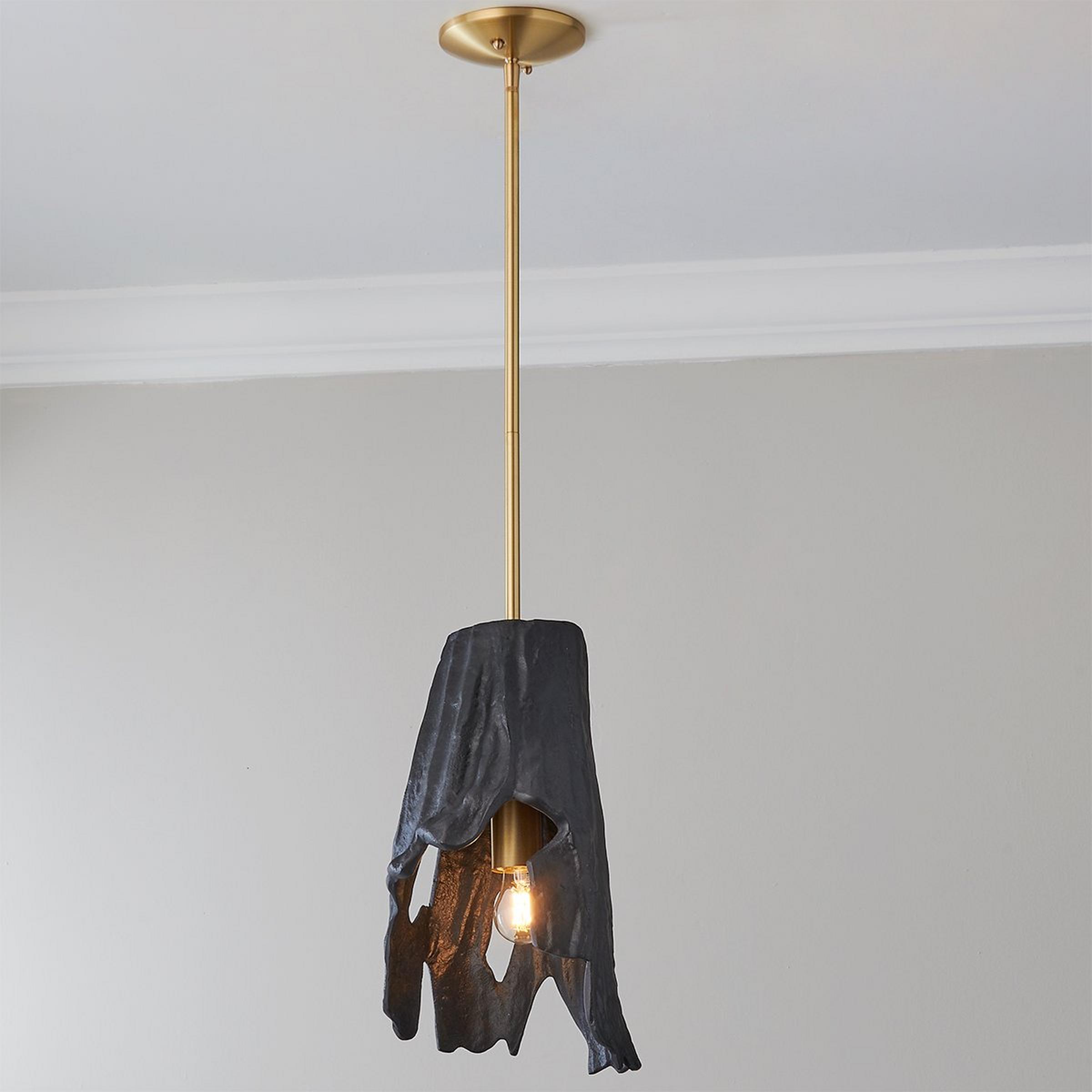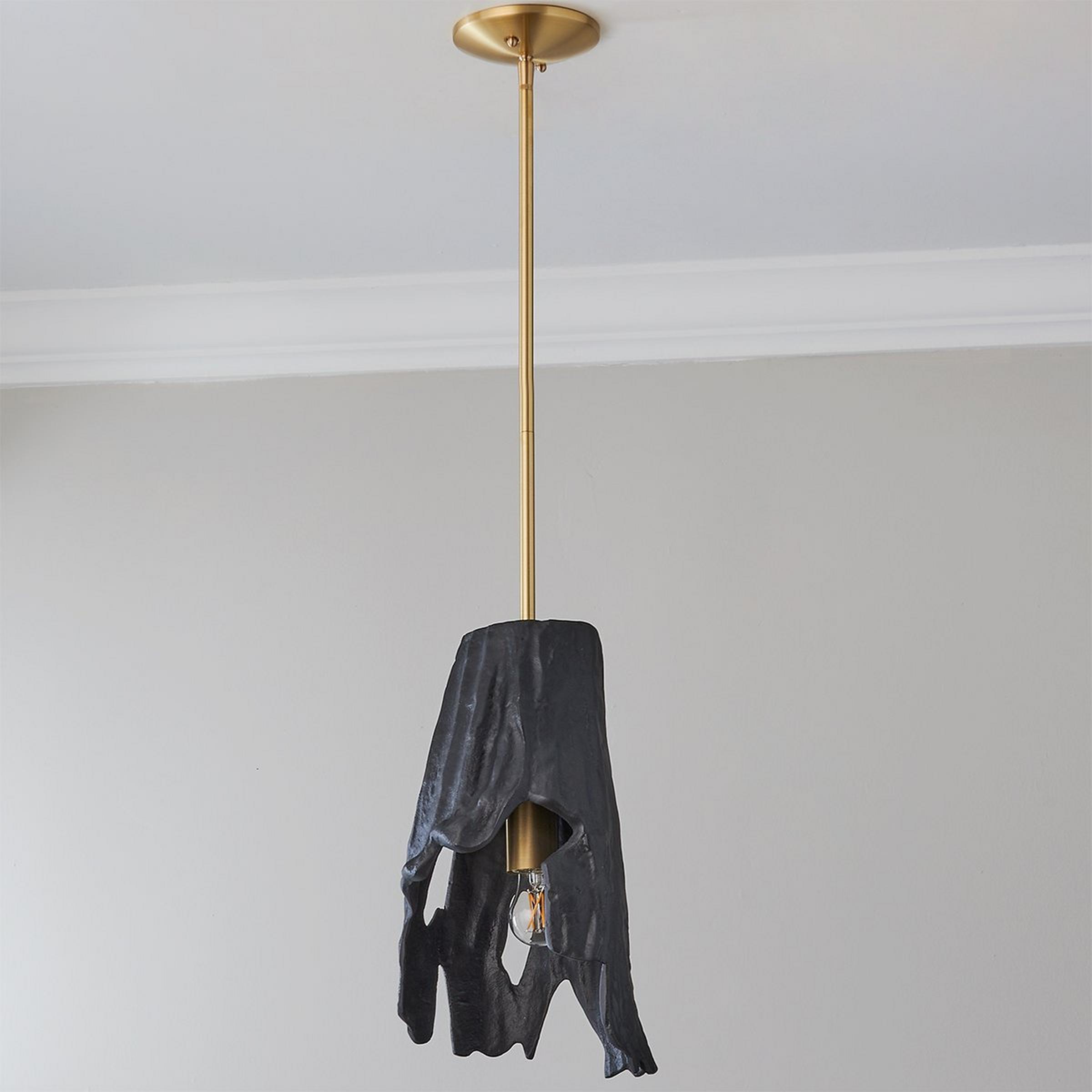 The Daru Pendant is a striking study in organic form and contemporary design. Its sculptural shade, with fluid curves and artful cutouts, evokes the raw beauty of natural textures while casting warm, ambient light. Brushed brass hardware adds a refined metallic accent, creating a harmonious balance between nature-inspired artistry and modern elegance. Perfect for making a bold statement in dining spaces, entryways, or creative interiors. This fixture is assembled by hand in our Richmond, Virginia production facility.