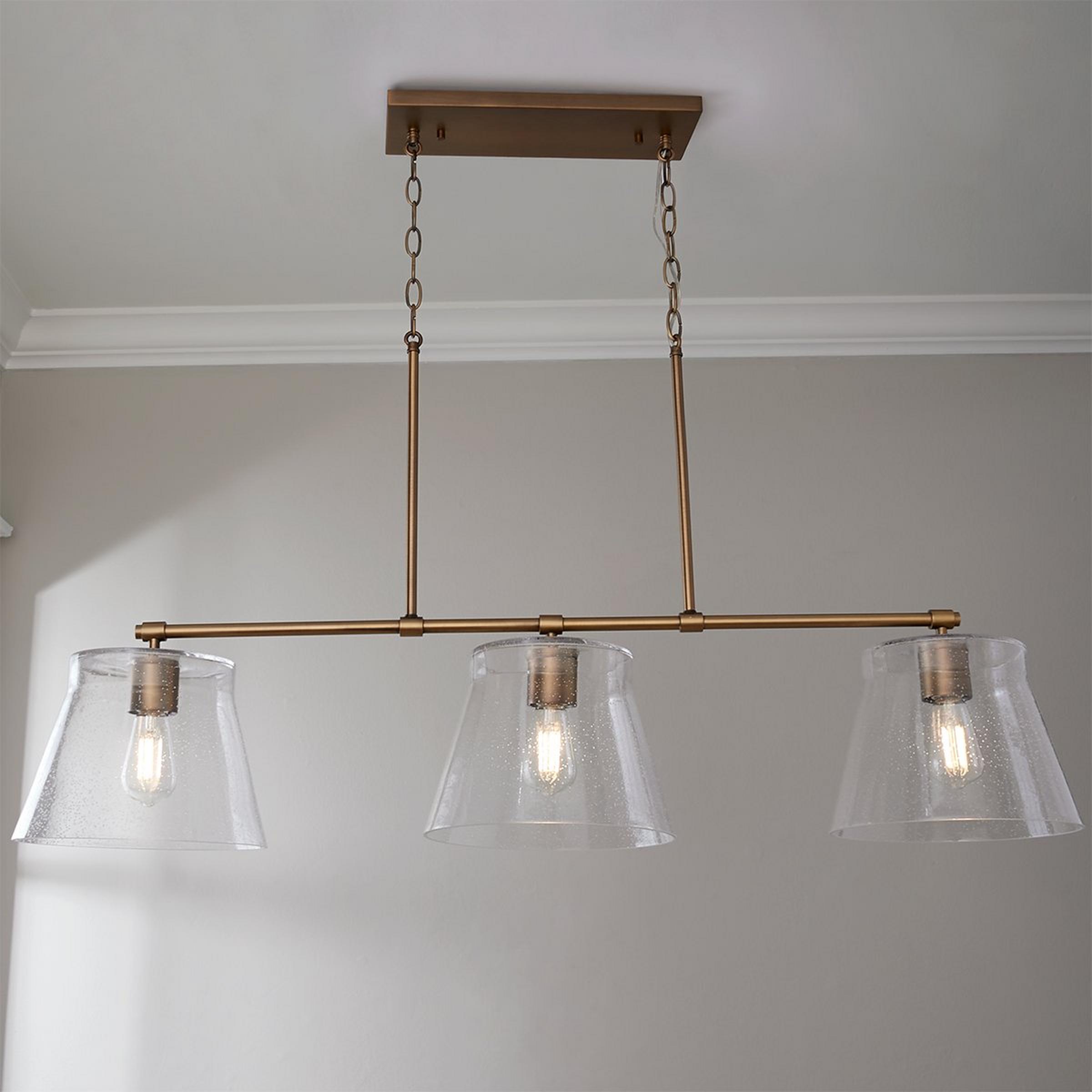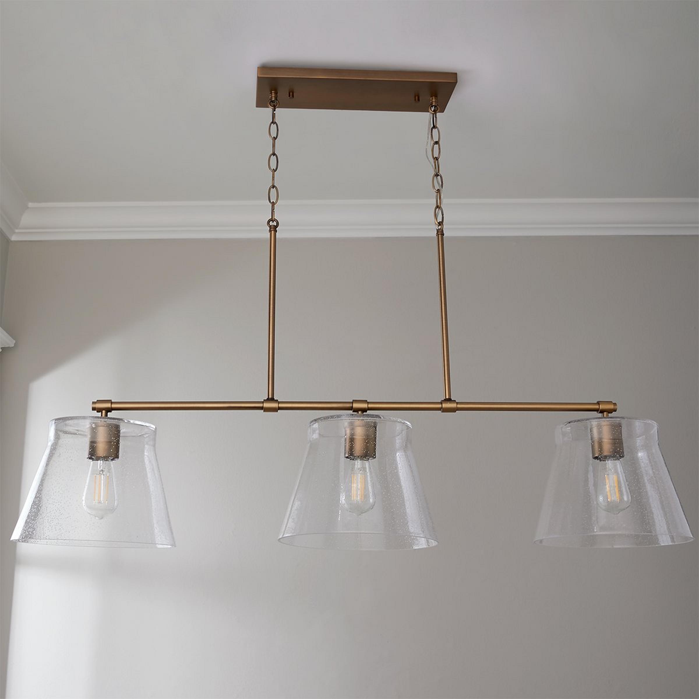 This linear framed light showcases sophisticated downward-facing seeded glass shades using a minimalist design for an effortless blending of stylings.