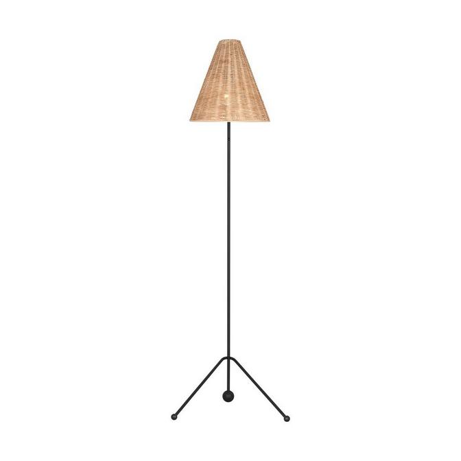 This floor lamp adds functionality and coziness to the home through thoughtful design and natural finishes. The spoked tripod base holds the pole of the lamp at a tilted angle to hang over a comfortable armchair for leisurely reading and writing. Due to the natural materials used, each piece is unique and may vary in tone.