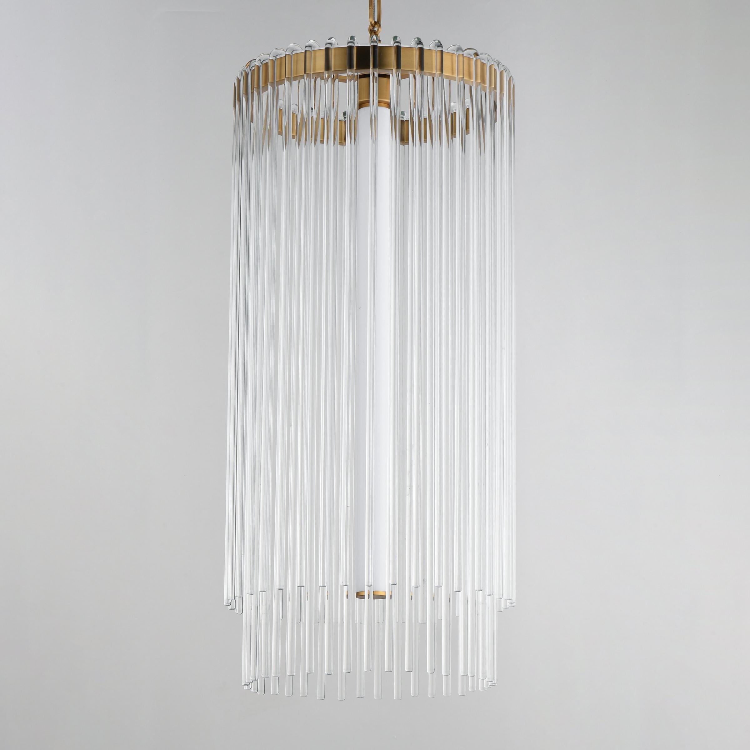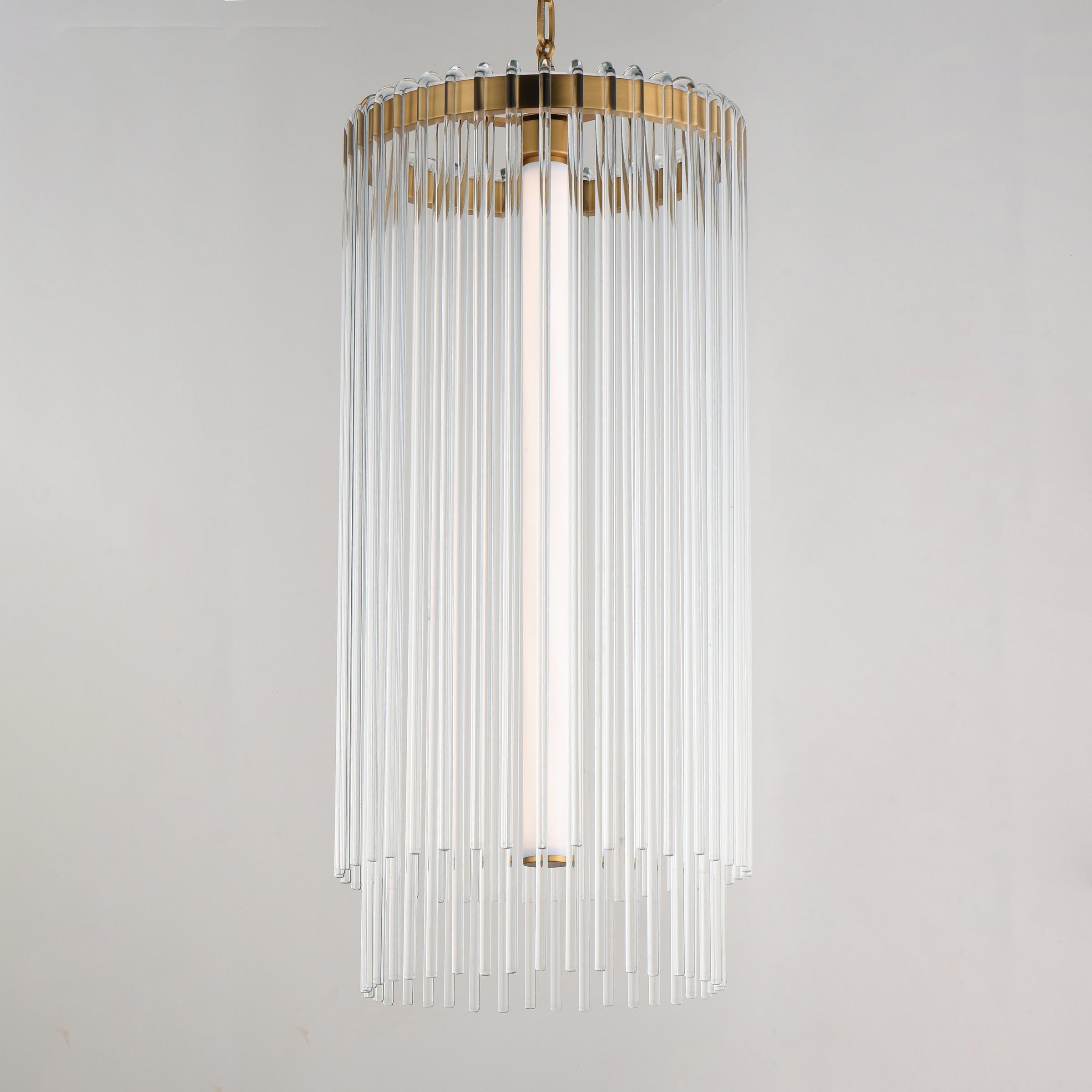 The Desirae Pendant features an elongated integrated LED that illuminates behind its curtain of draped glass rods. The glittering effect of light shining through the layered glass is enchanting and creates the look of effortless glamour. Customize your atmosphere by switching the color temperature to warm or cool tones even after installation. Refining simplicity, this light's clean lines and minimal hardware look luxurious and elevate your space.
